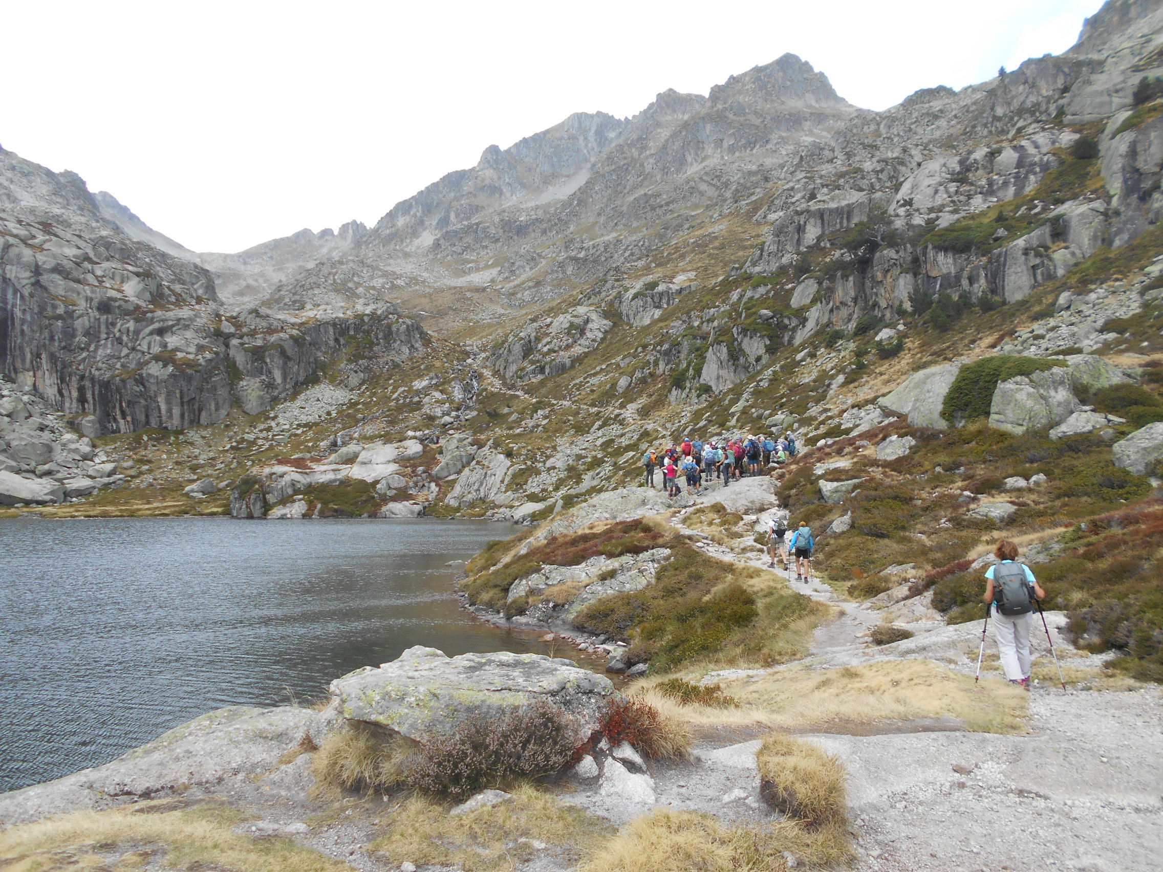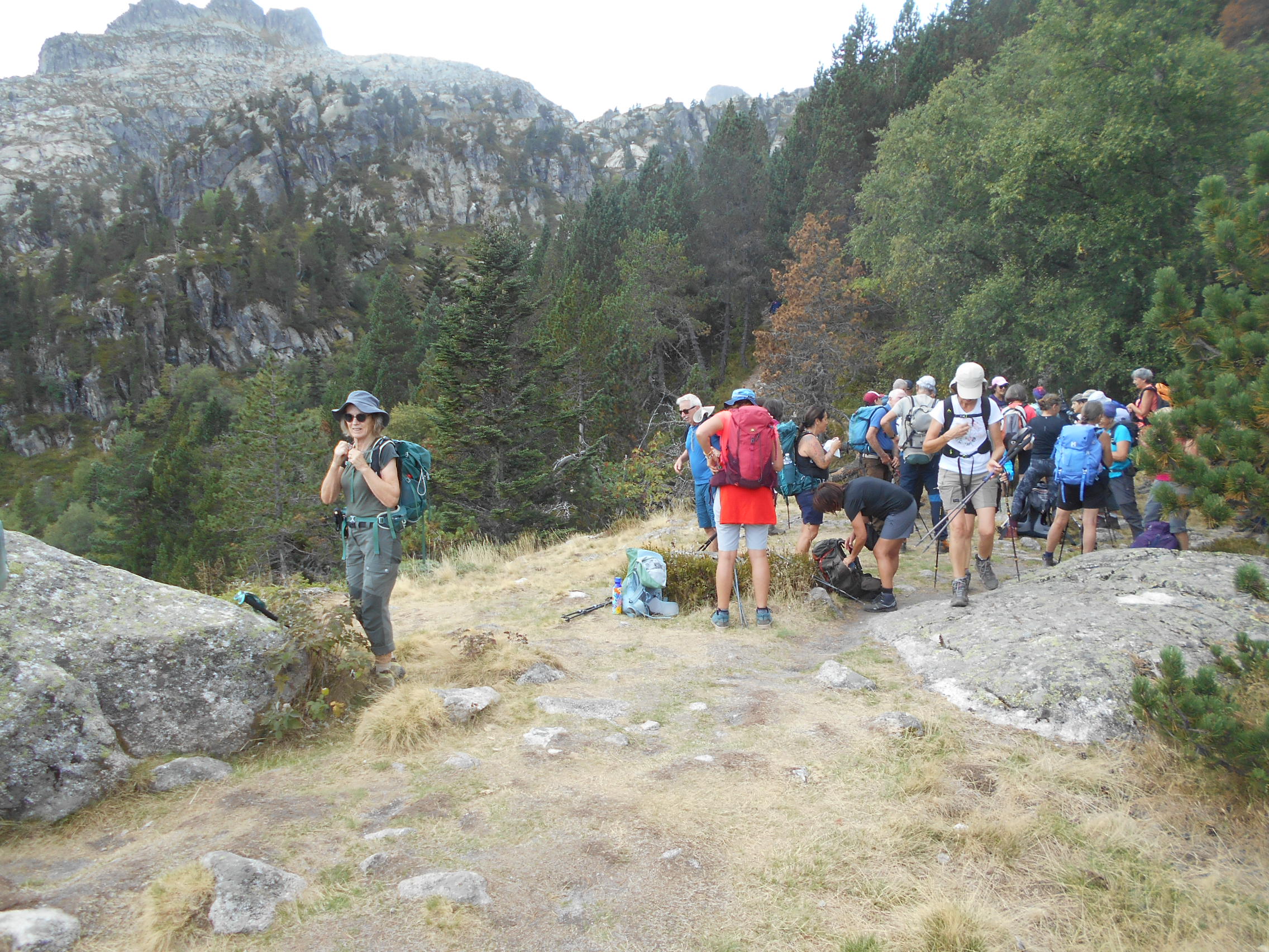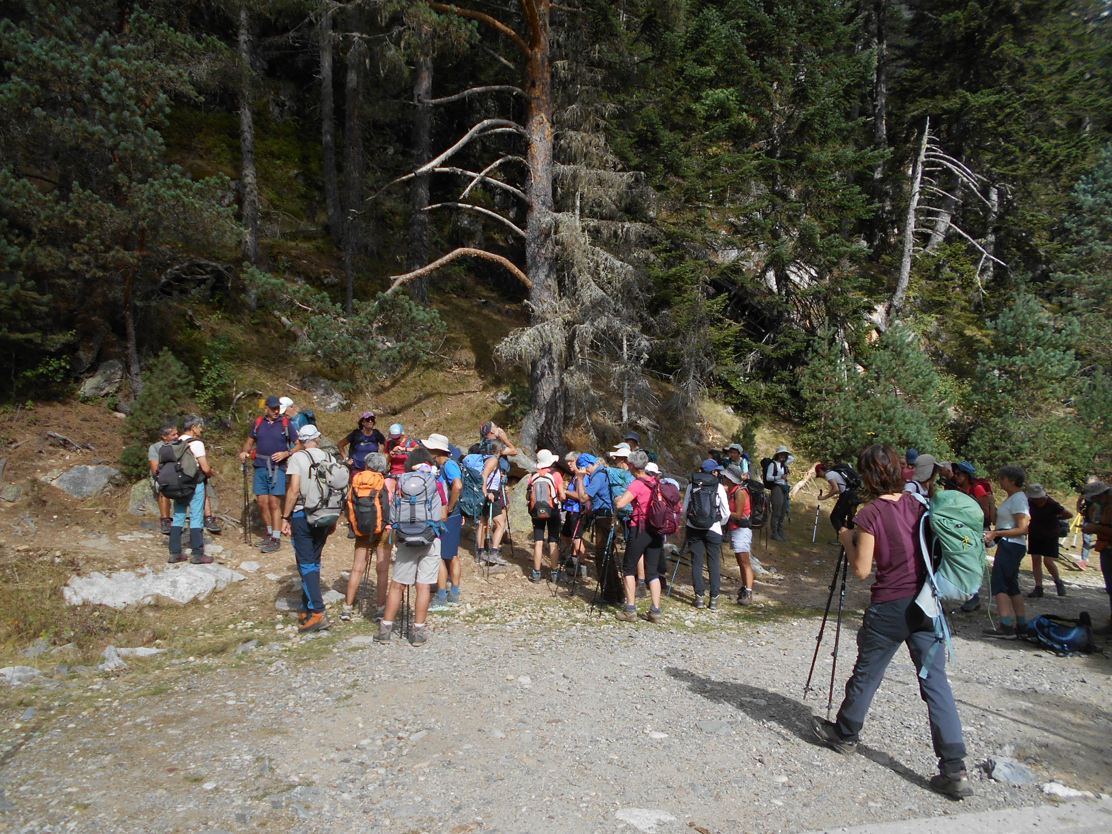 Garés au Pont d’Espagne, nous traversons le long plateau de Cayan jusqu’au pied de la forêt. La pente est rapidement redressée et les conversations de retrouvailles s’espacent. A la sortie de la forêt le rideau s’ouvre sur les sommets bordant la vallée. Un premier groupe mangera au lac inférieur de l’Embarrat et le deuxième fera de même au lac supérieur.
