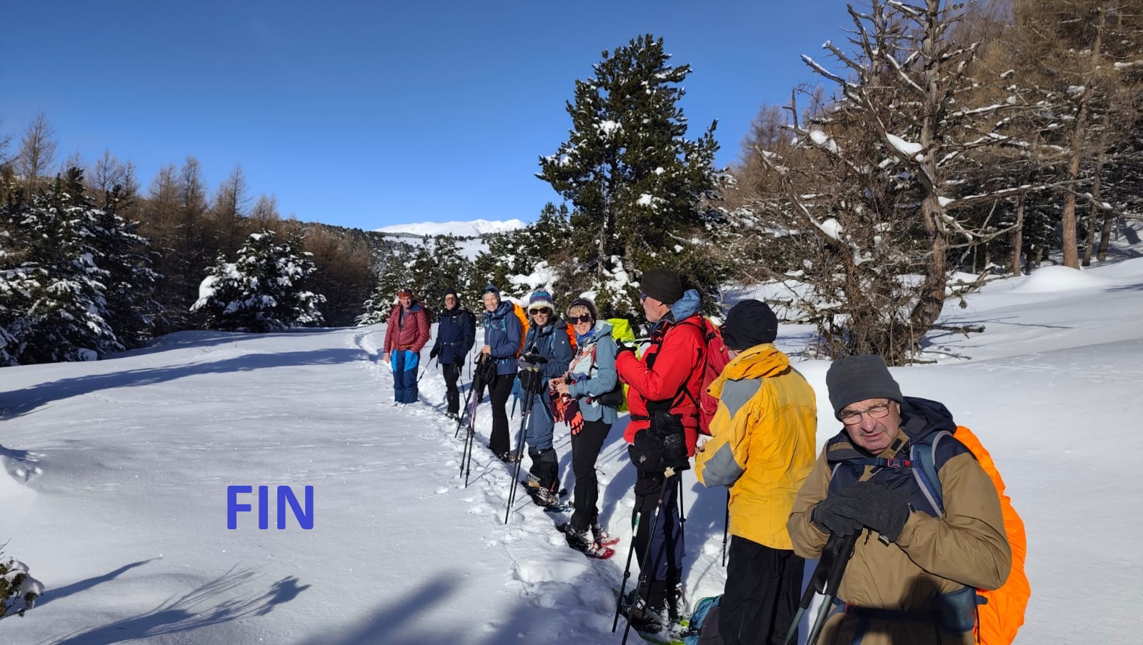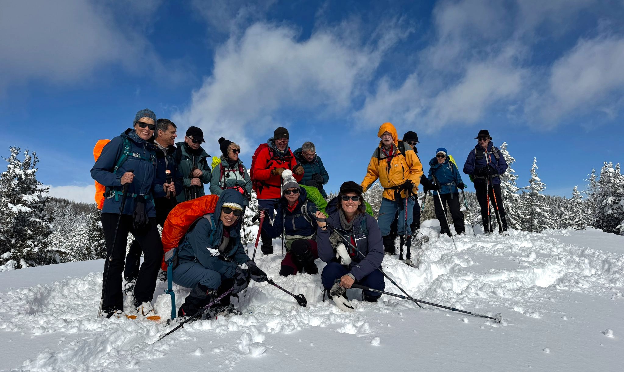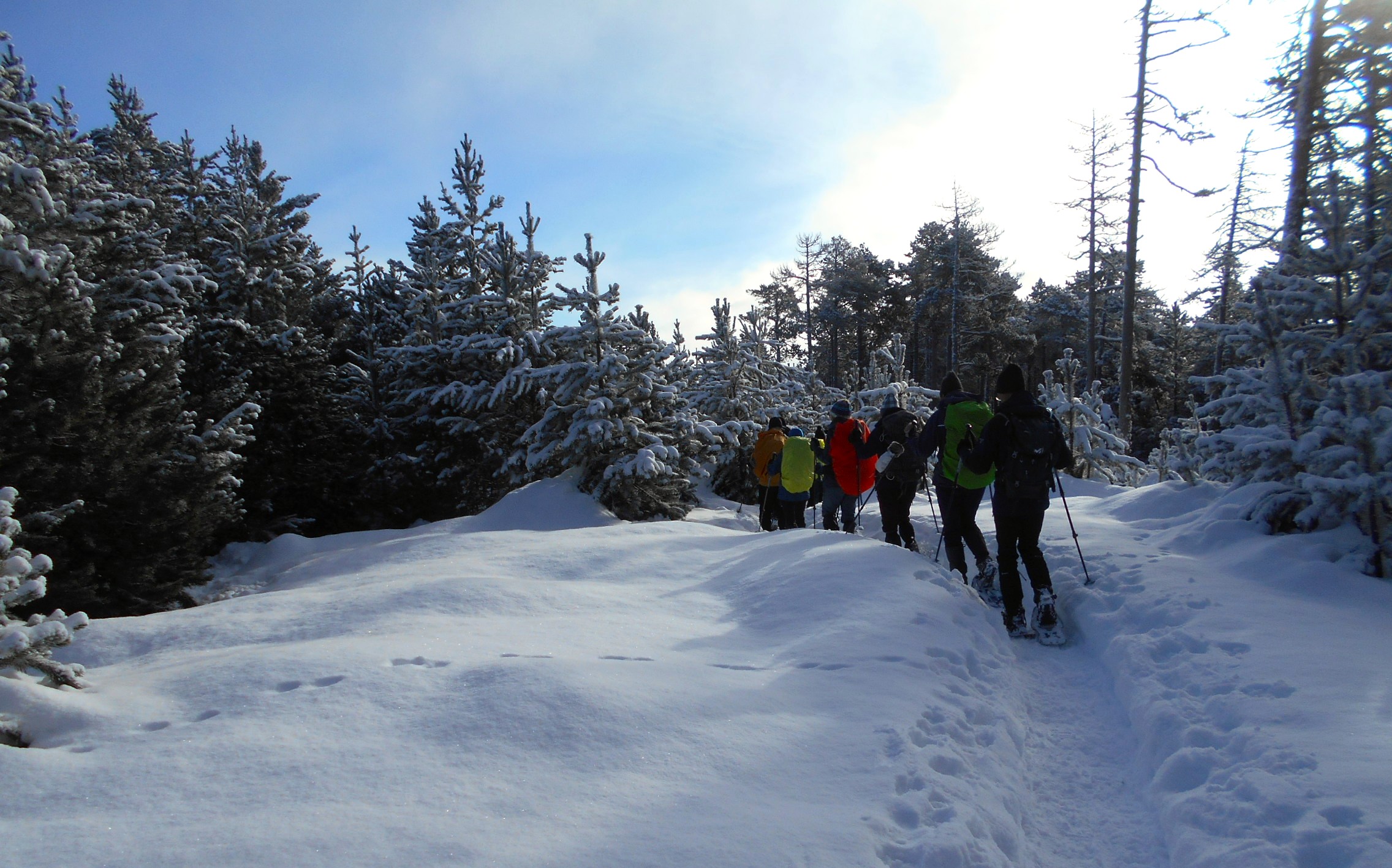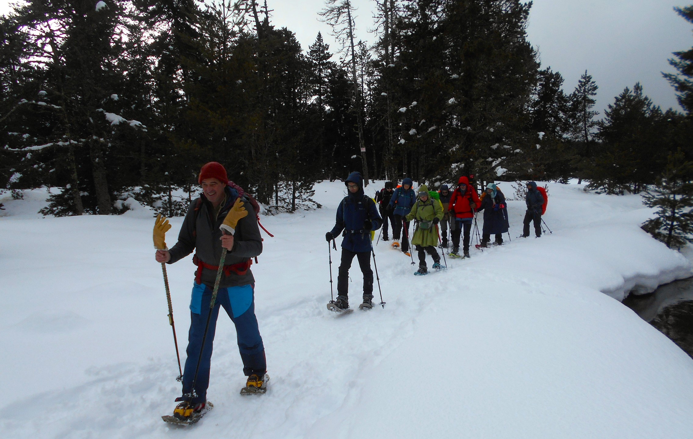 Mercredi 28, les routes verglacées nous incitent à quitter le gîte raquettes aux pieds pour rejoindre l’étang gelé de Ticou, entouré de sa forêt de sapins délicatement saupoudrée de neige fraiche. L’après-midi nous partons du parking des Errels, à la station de ski de Font-Romeu. Fred et quelques adhérents valeureux ouvrent la trace vers les hauteurs de la station, offrant une vue panoramique exceptionnelle sur la chaine frontalière, du pic du Canigou jusqu’au Carlit.