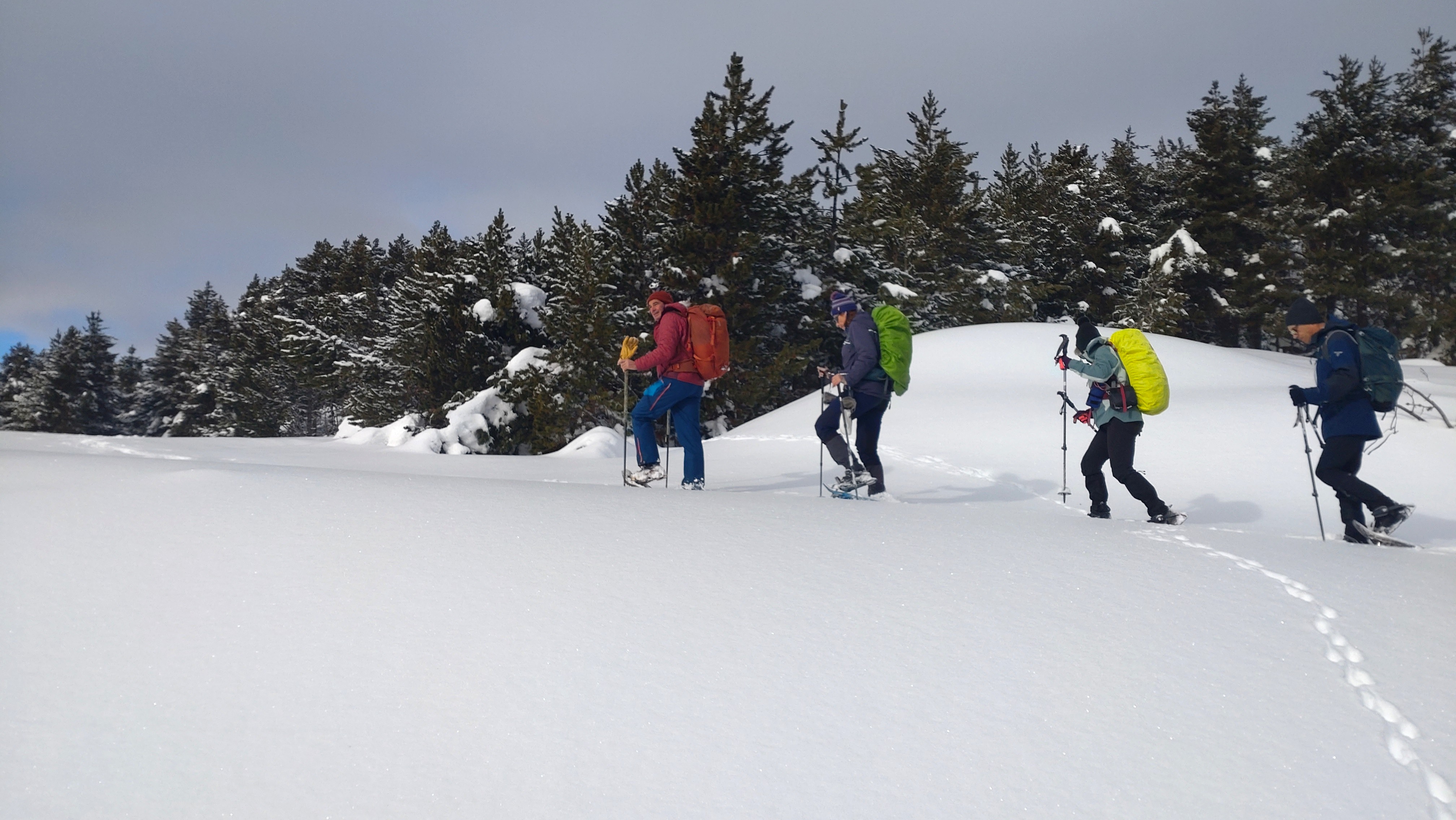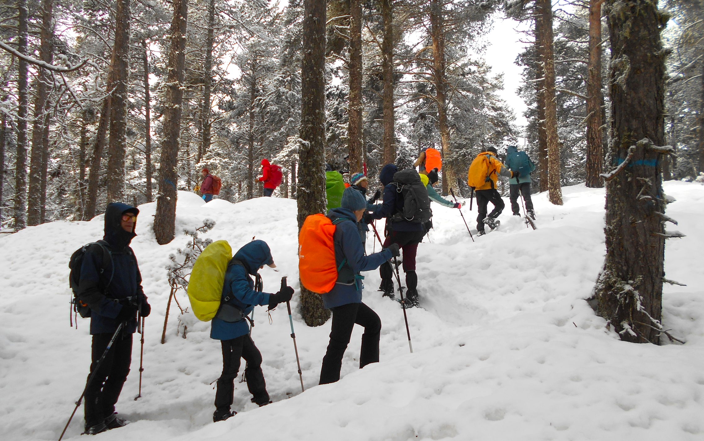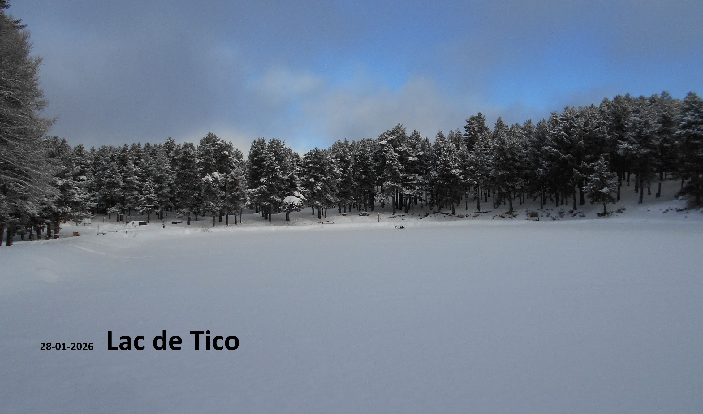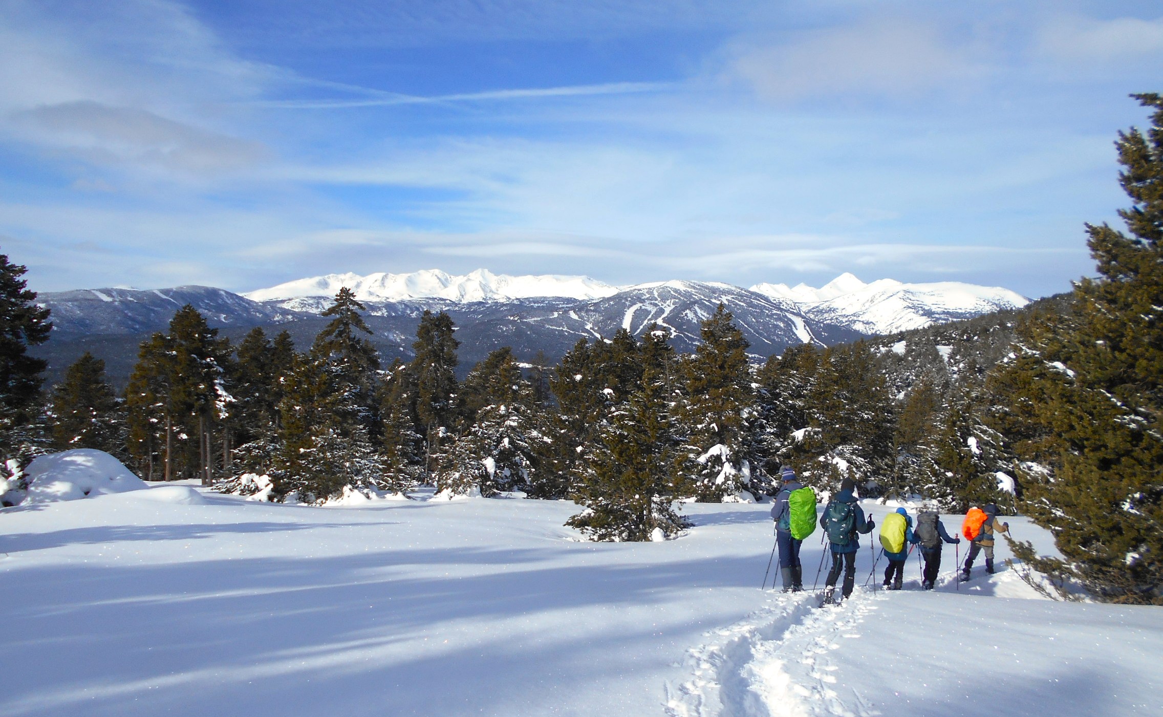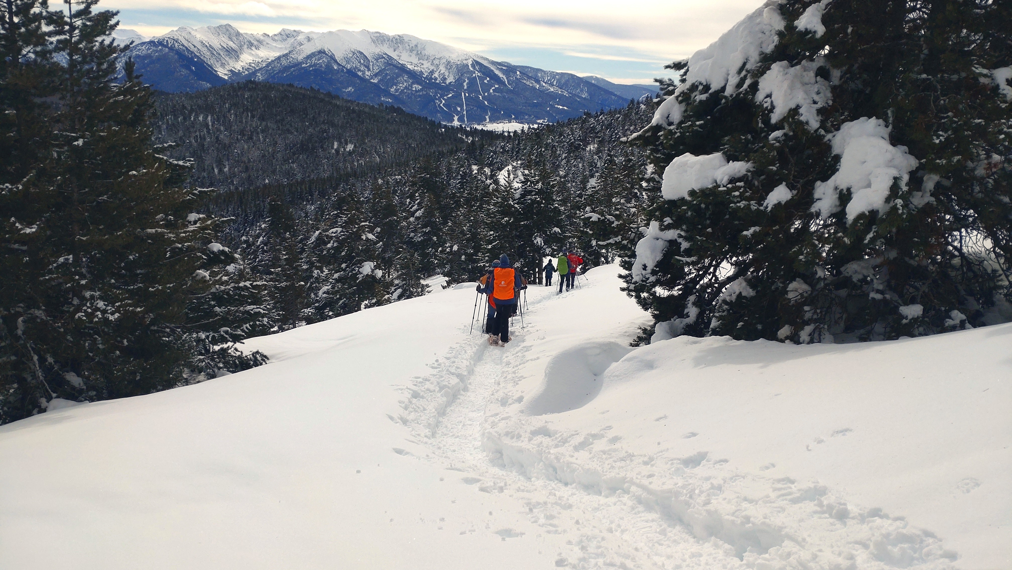 Mercredi 28, les routes verglacées nous incitent à quitter le gîte raquettes aux pieds pour rejoindre l’étang gelé de Ticou, entouré de sa forêt de sapins délicatement saupoudrée de neige fraiche. L’après-midi nous partons du parking des Errels, à la station de ski de Font-Romeu. Fred et quelques adhérents valeureux ouvrent la trace vers les hauteurs de la station, offrant une vue panoramique exceptionnelle sur la chaine frontalière, du pic du Canigou jusqu’au Carlit.