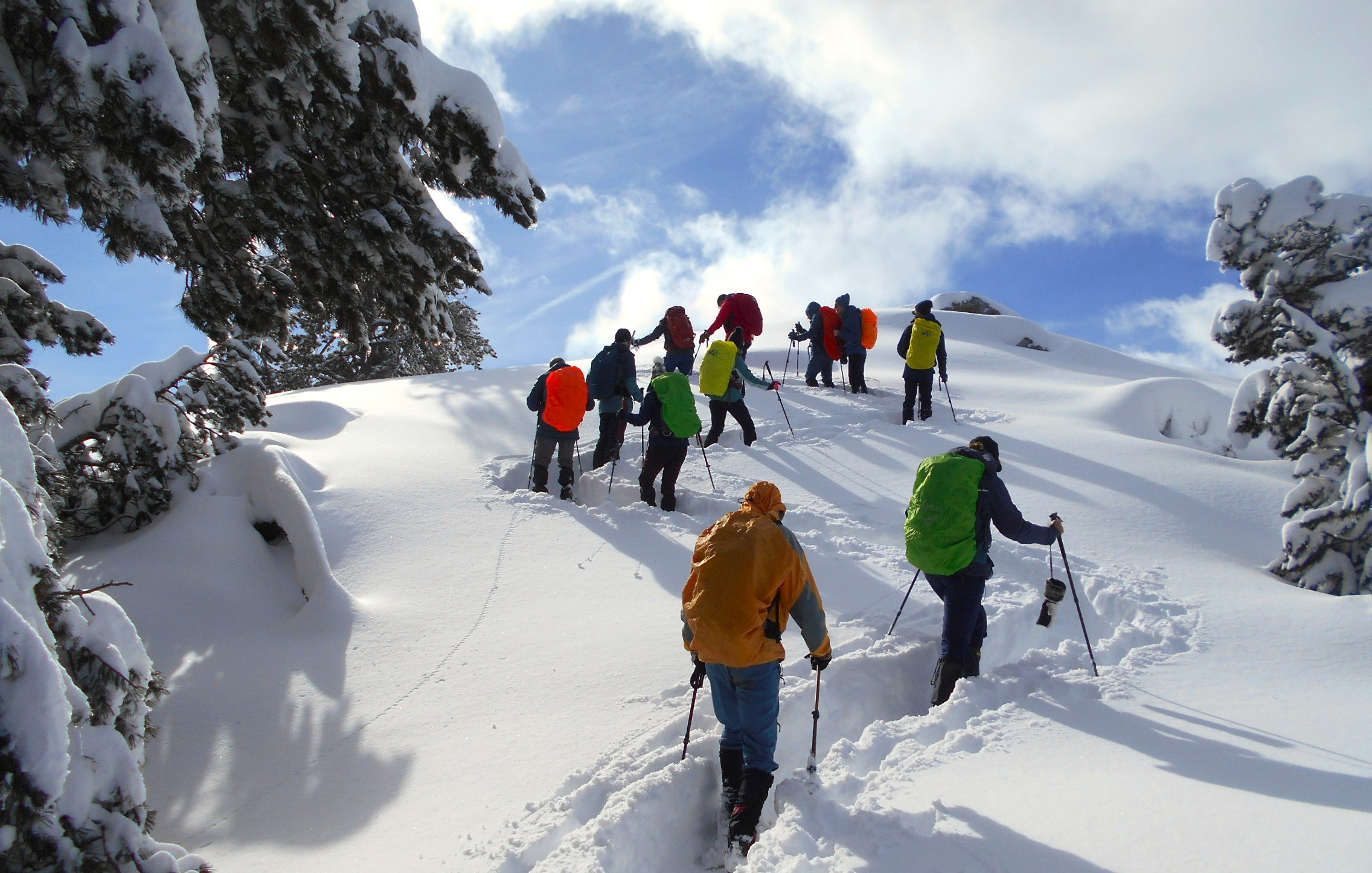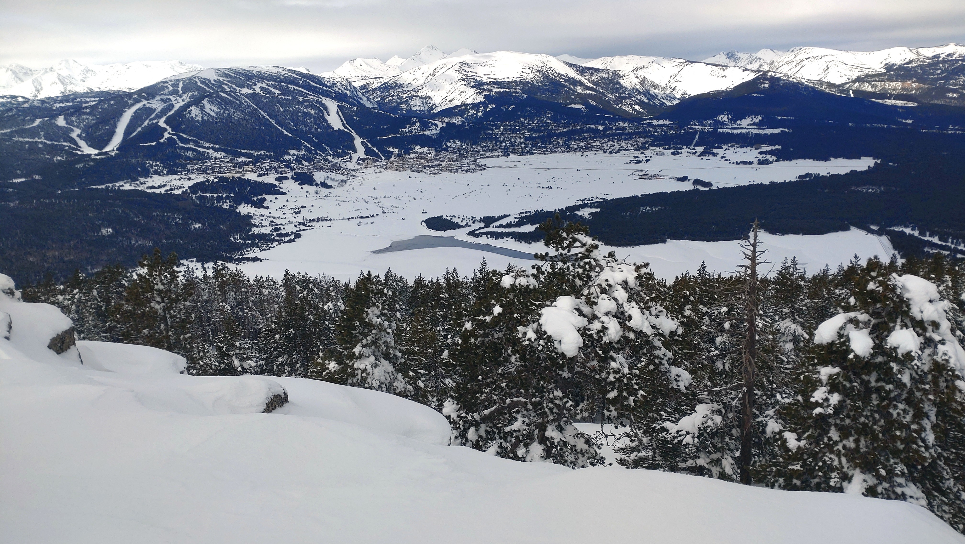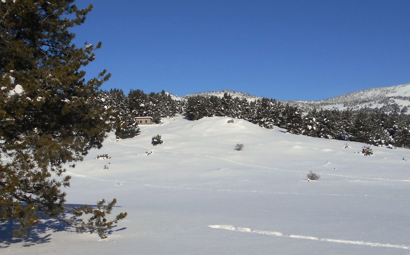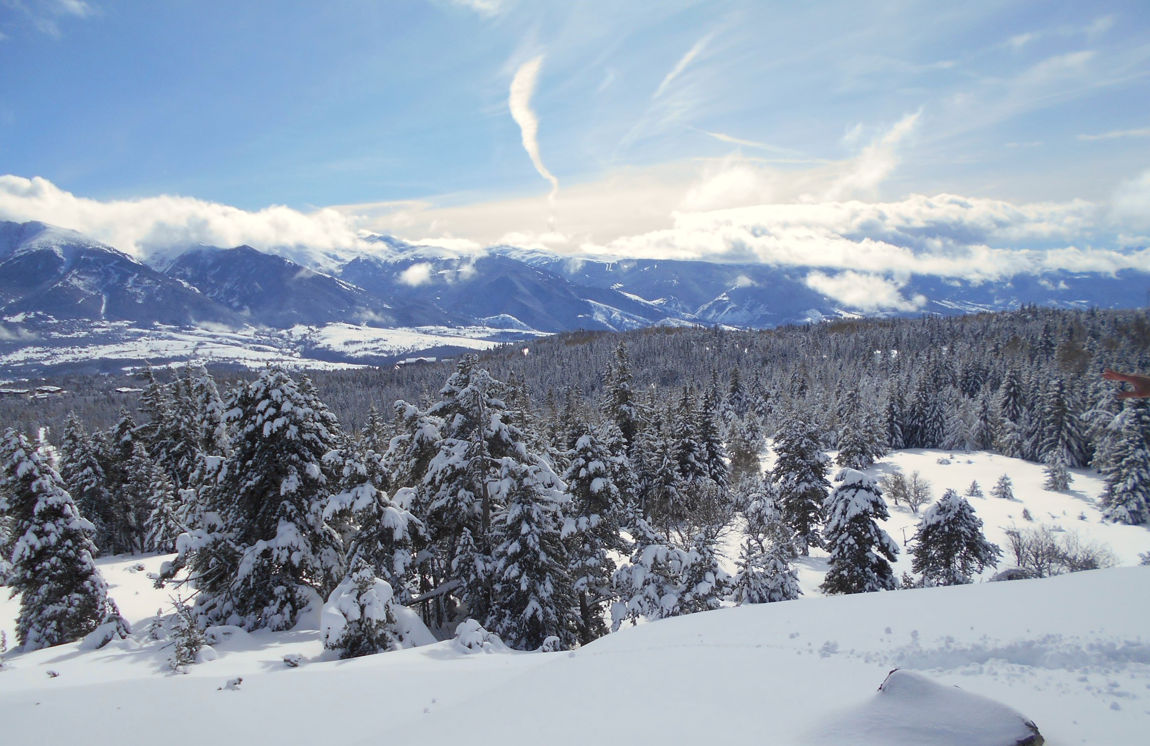 Mercredi 28, les routes verglacées nous incitent à quitter le gîte raquettes aux pieds pour rejoindre l’étang gelé de Ticou, entouré de sa forêt de sapins délicatement saupoudrée de neige fraiche. L’après-midi nous partons du parking des Errels, à la station de ski de Font-Romeu. Fred et quelques adhérents valeureux ouvrent la trace vers les hauteurs de la station, offrant une vue panoramique exceptionnelle sur la chaine frontalière, du pic du Canigou jusqu’au Carlit.