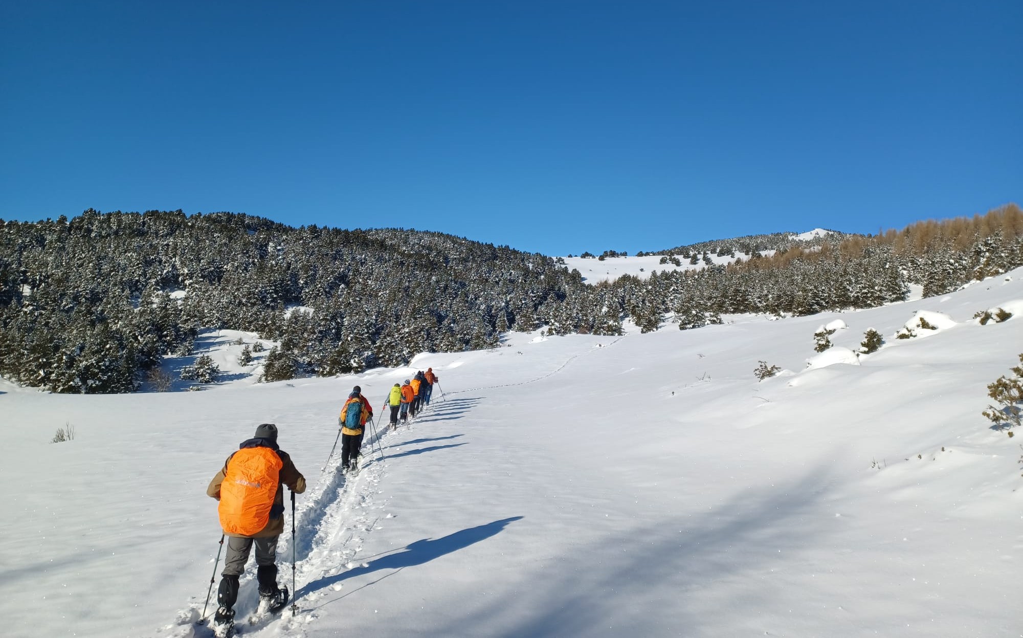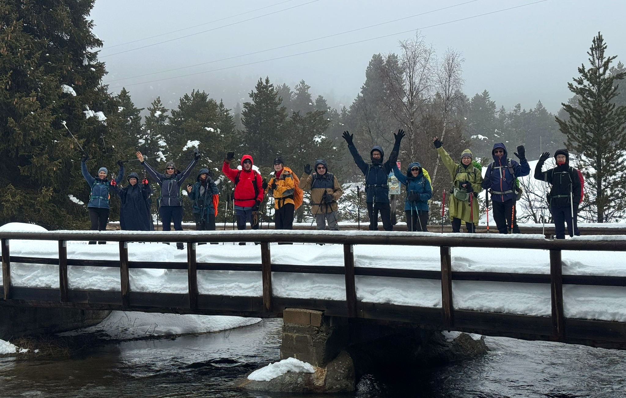 Jeudi 29. Ce jour nous sommes partis du col de la Llose qui se situe à une altitude de 1866m. Une journée hors des sentiers battus, où nous avons alterné des petites montées et descentes, tout en suivant les traces du grand tétras, des martres, des lièvres, puis des renards et écureuils. Une fois arrivés au parking, le compteur affichait une distance de 11,5 kms et un dénivelé cumulé de 400m. Pour clôturer la journée, nous avons partagé un moment de convivialité avec notre guide Fred autour d’un apéro.