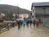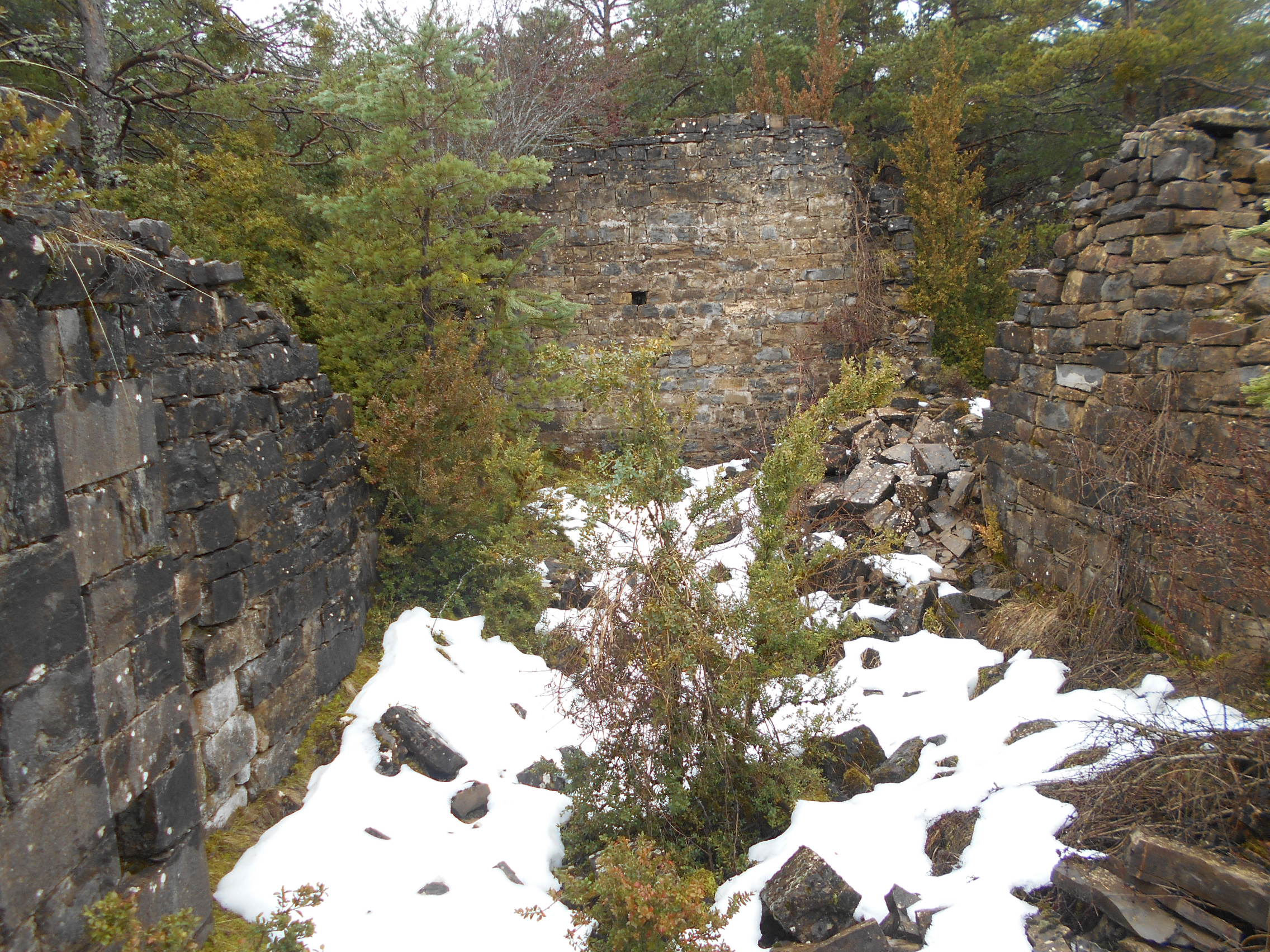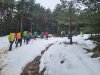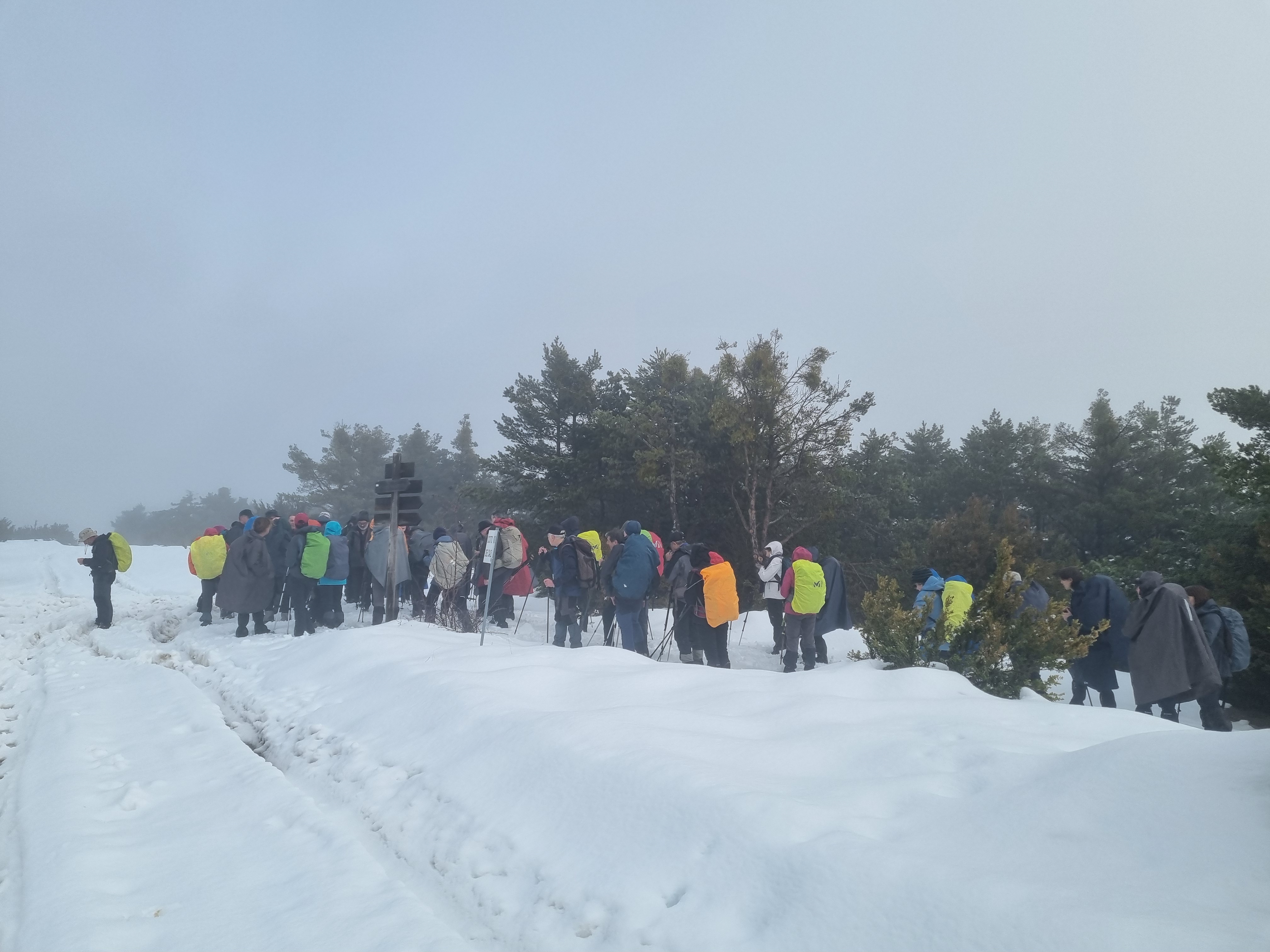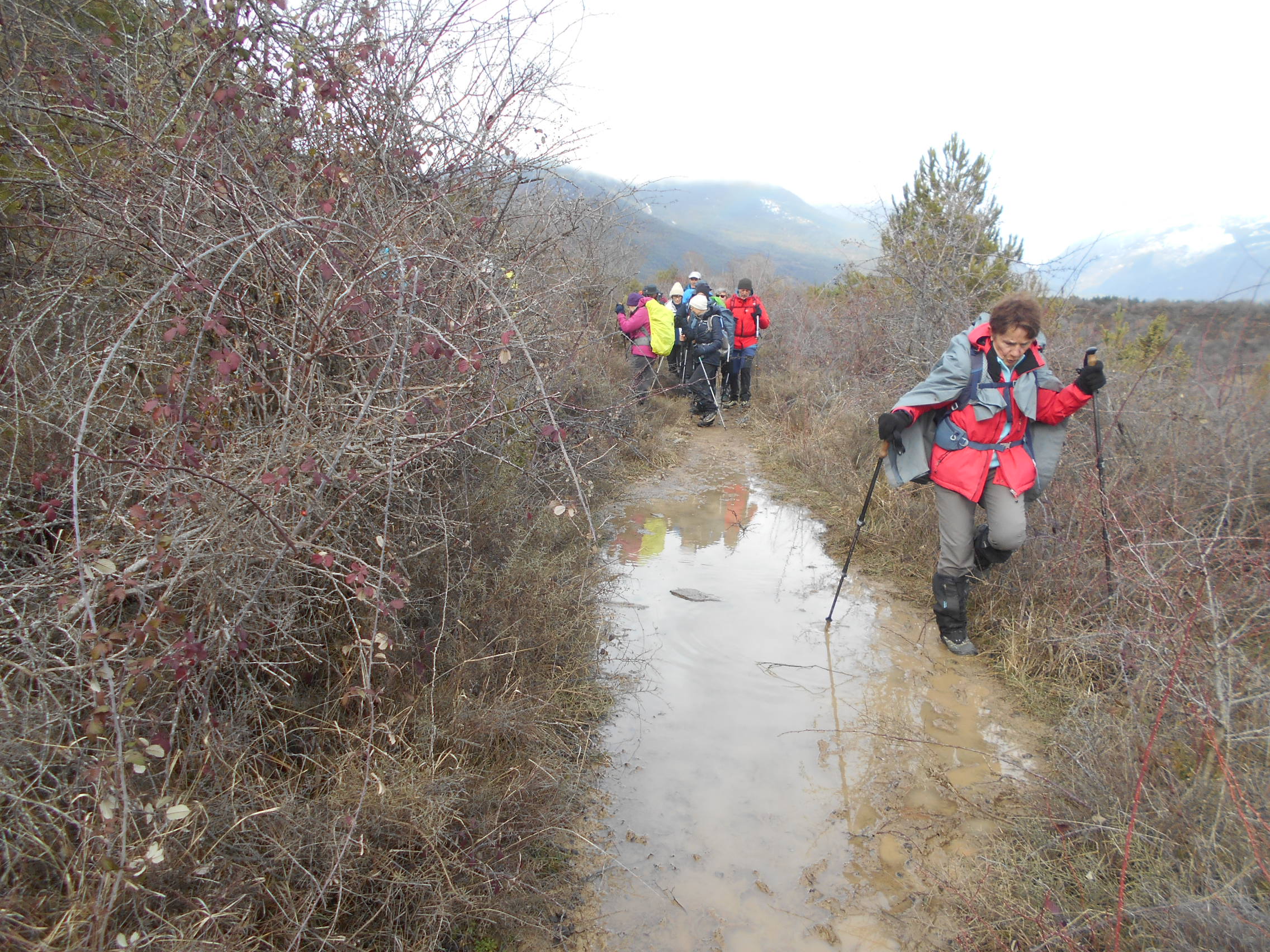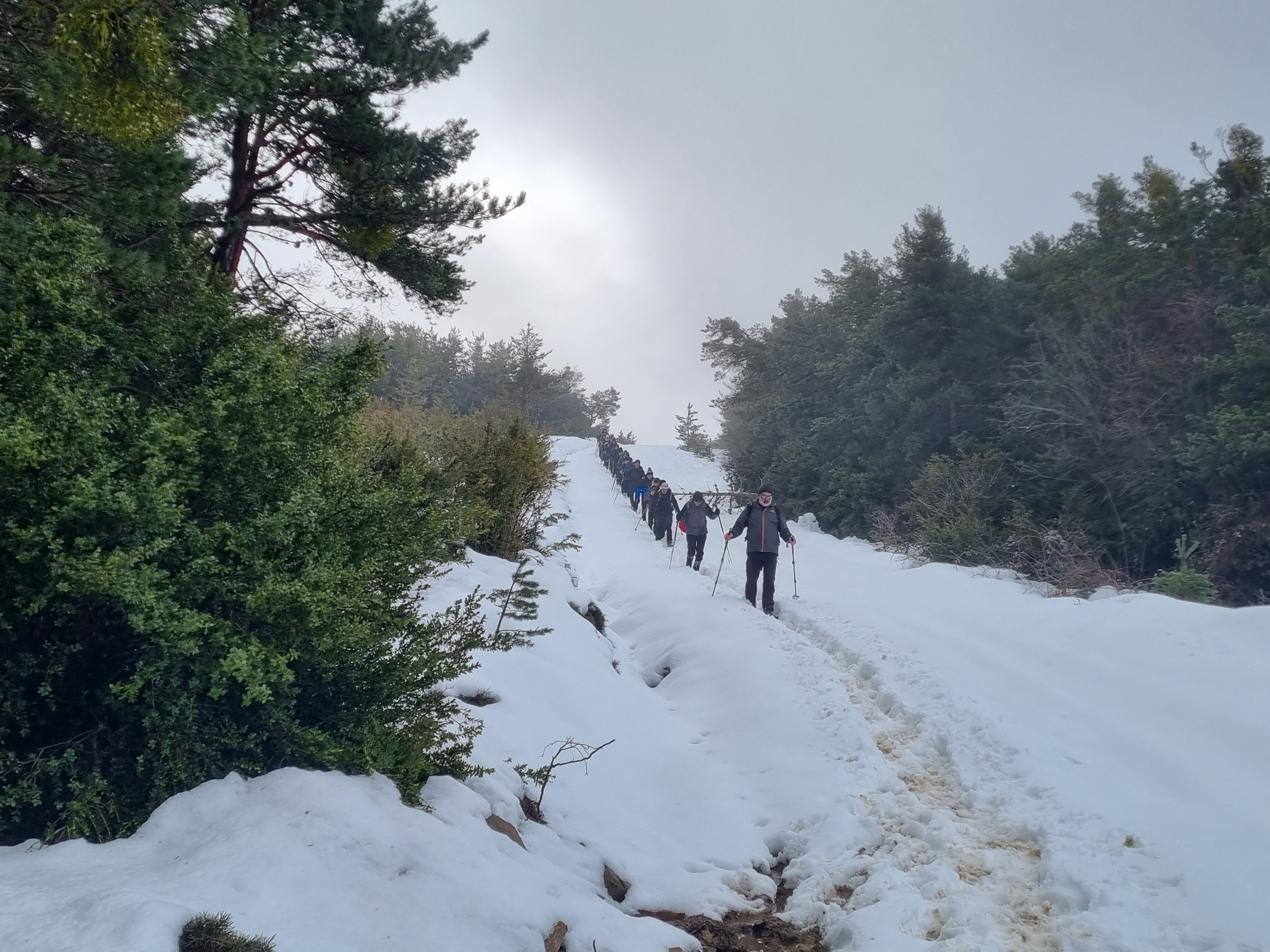 Aux deux tiers de la montée par la large piste qui rejoint la crête, après la visite des ruines de l’Ermitage de St Bartolémé, nous commençons à fouler la neige au moment où les premiers vrais rayons de soleil viennent nous réchauffer.