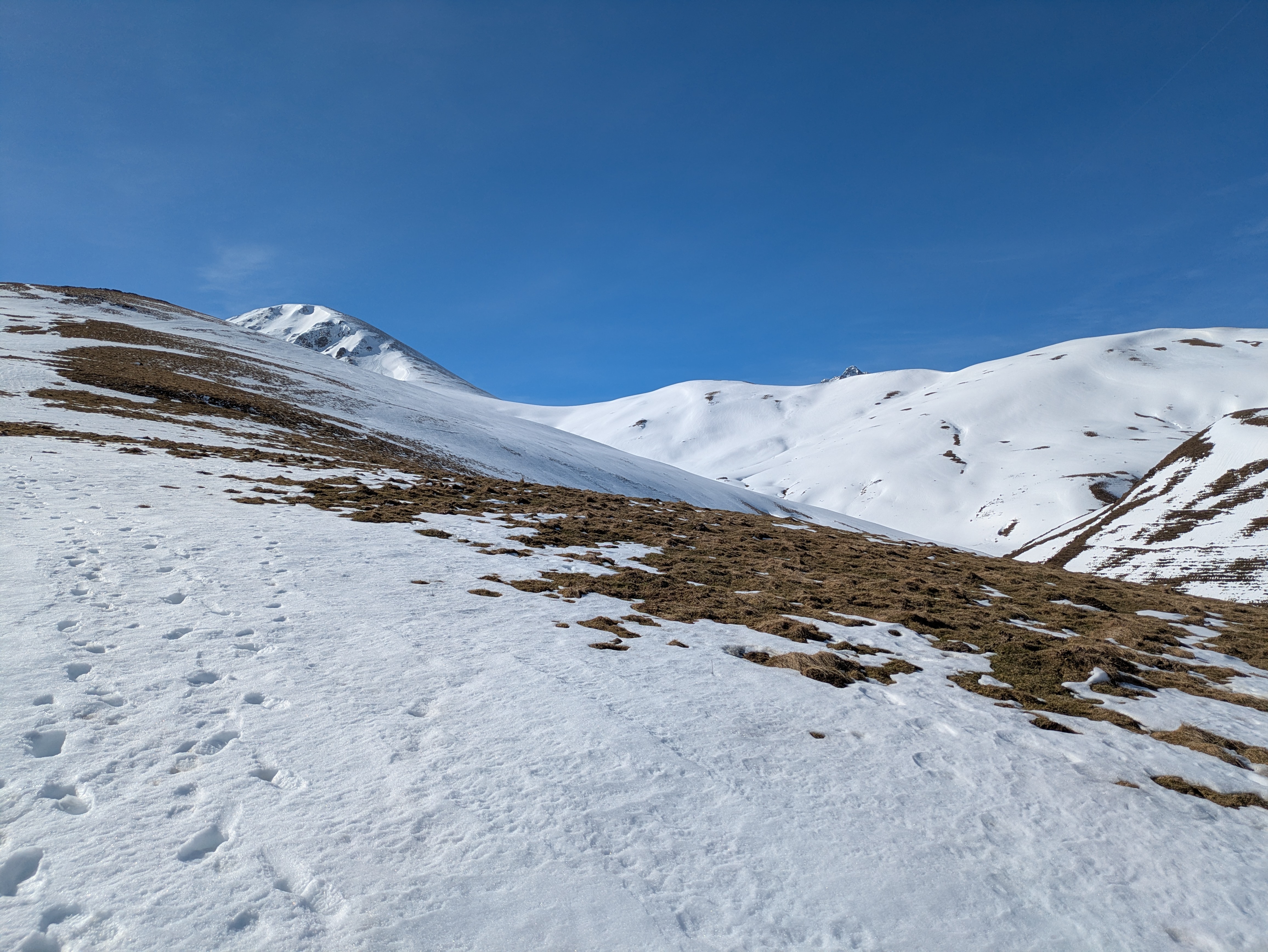 La neige est en déficit dans ce bas fond, mais les hauts sommets sont bien garnis.