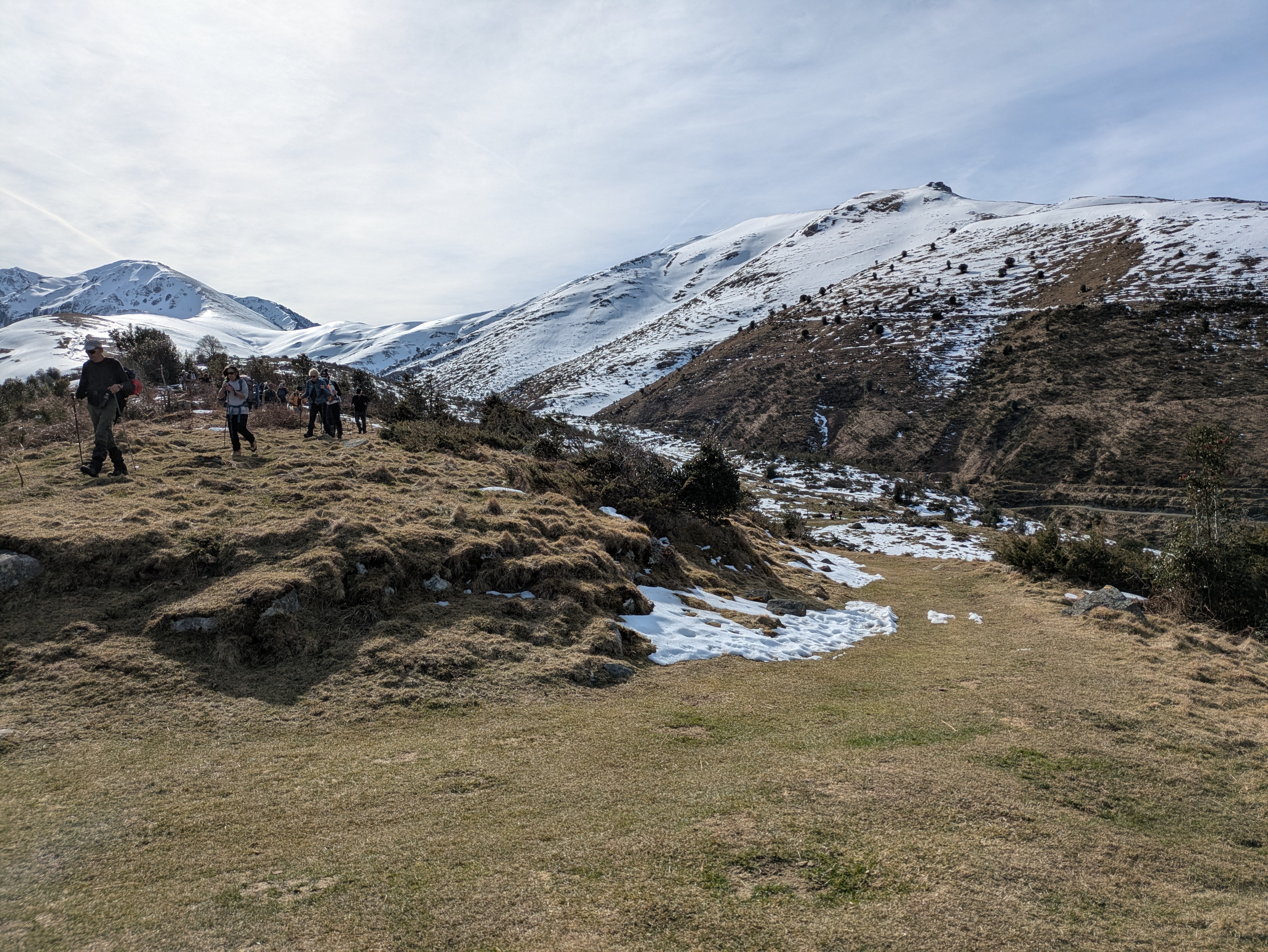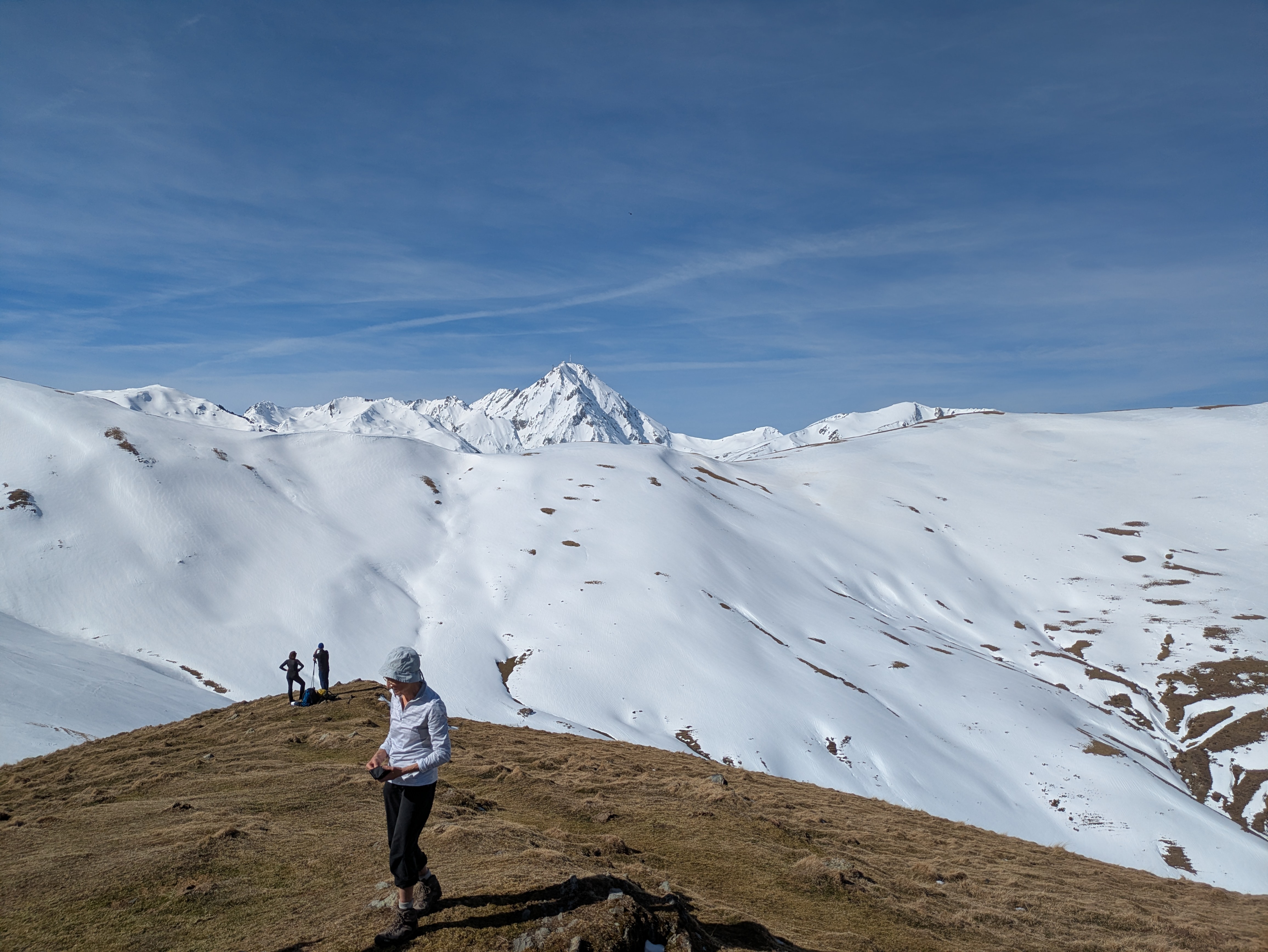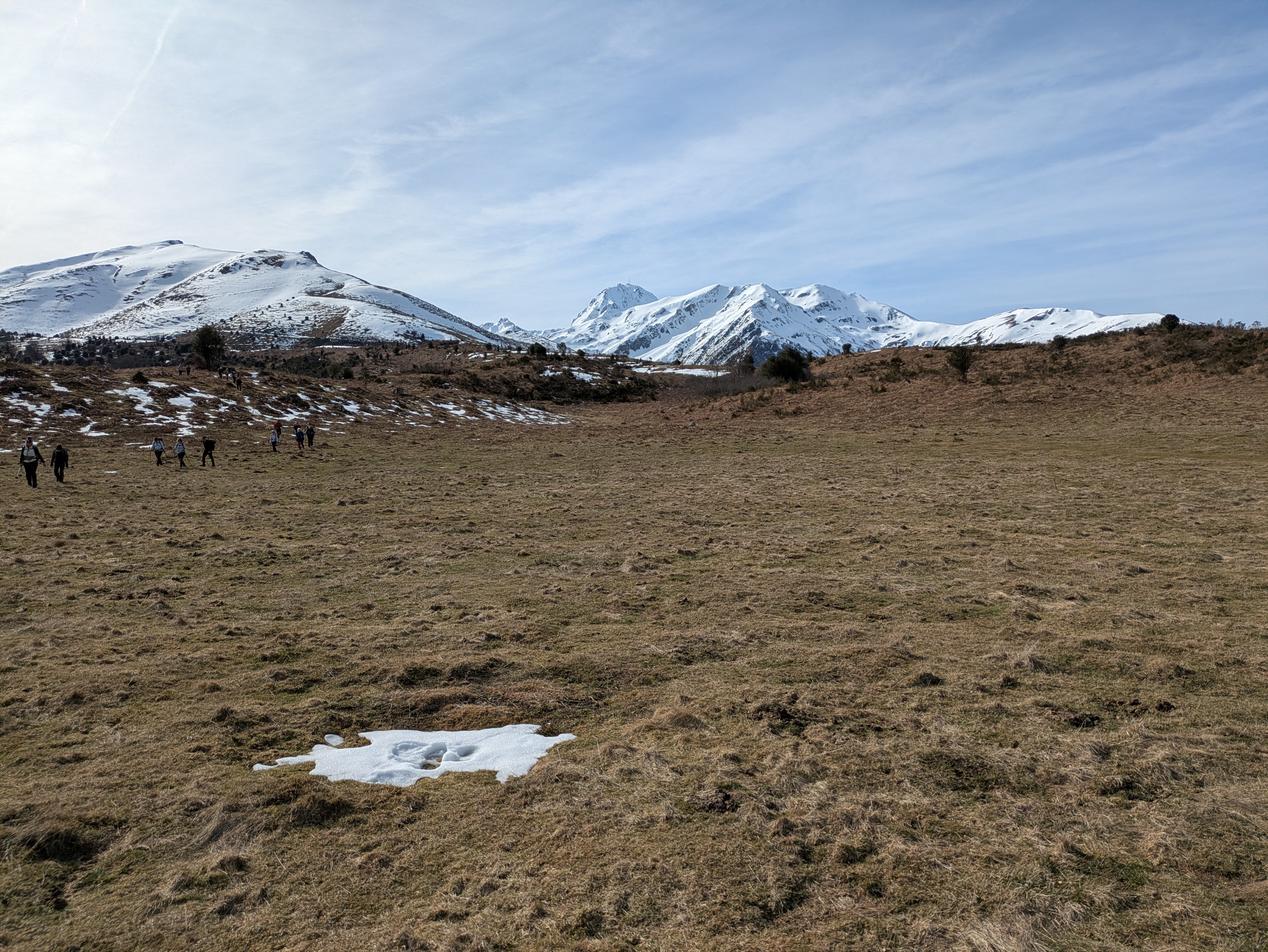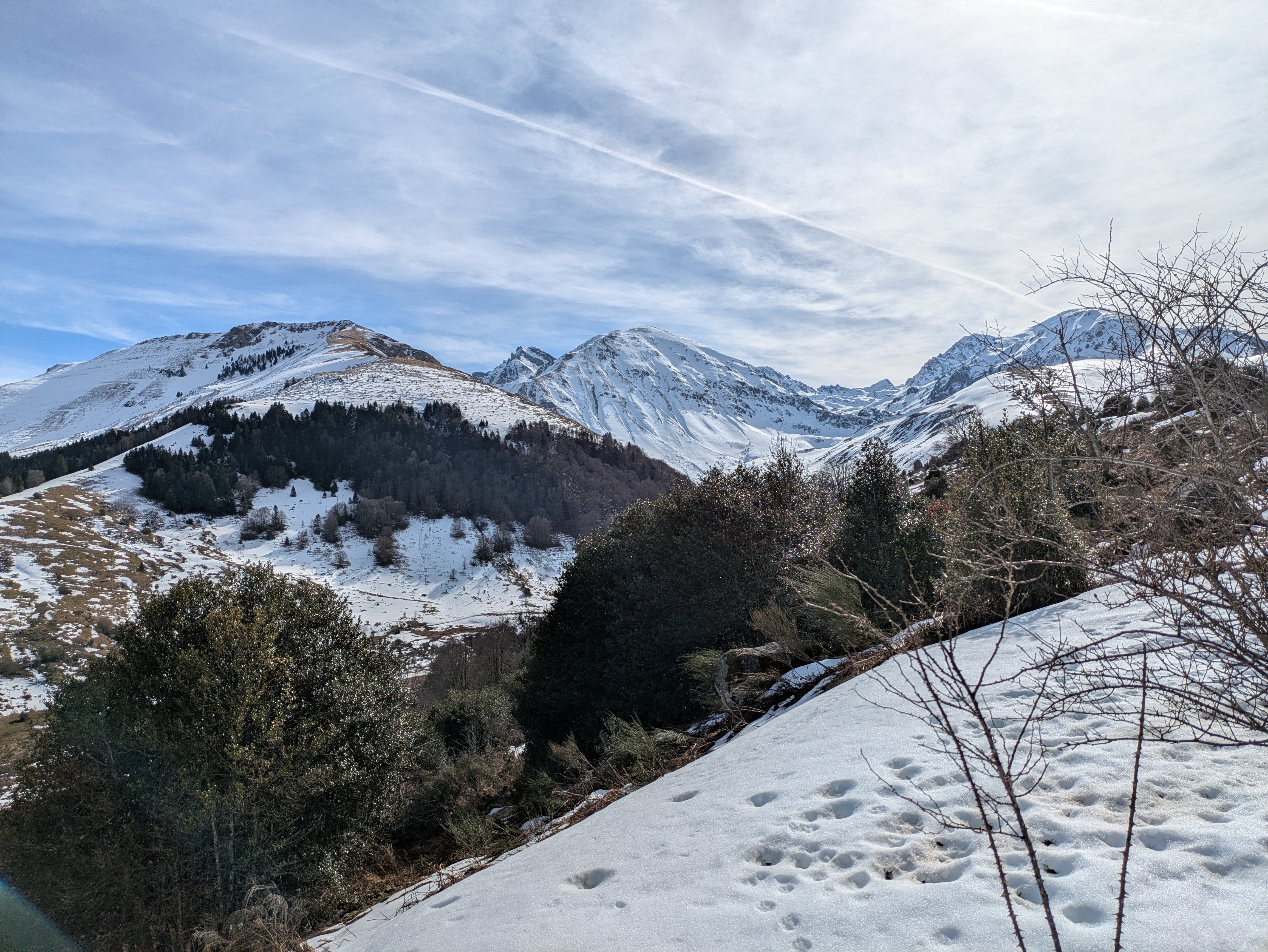 Après ce bain de soleil, nous entamons la descente raquettes aux pieds. La piste c’est assouplie, et en en quelques lacets nous regagnons les prairies printanières.