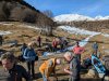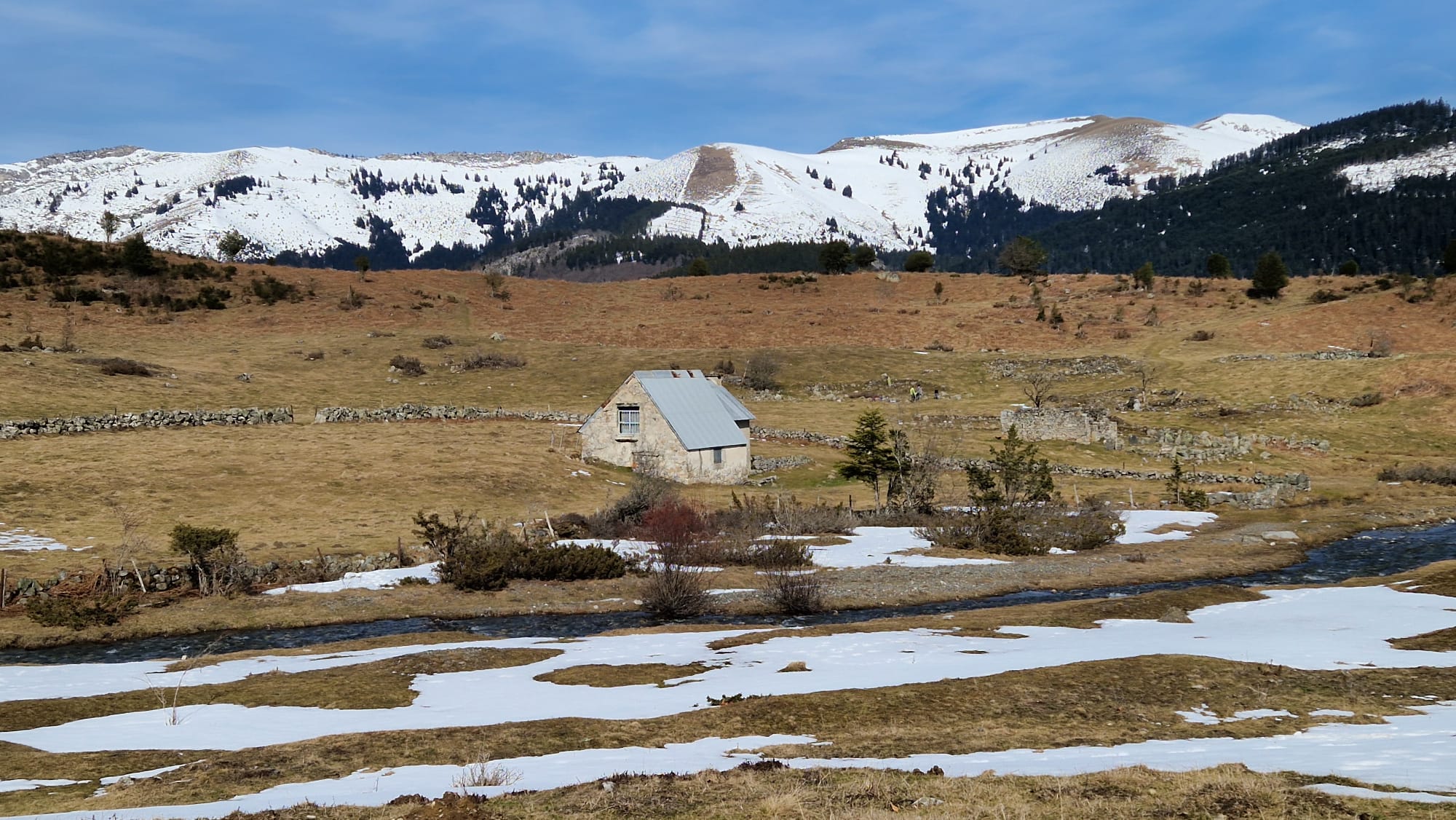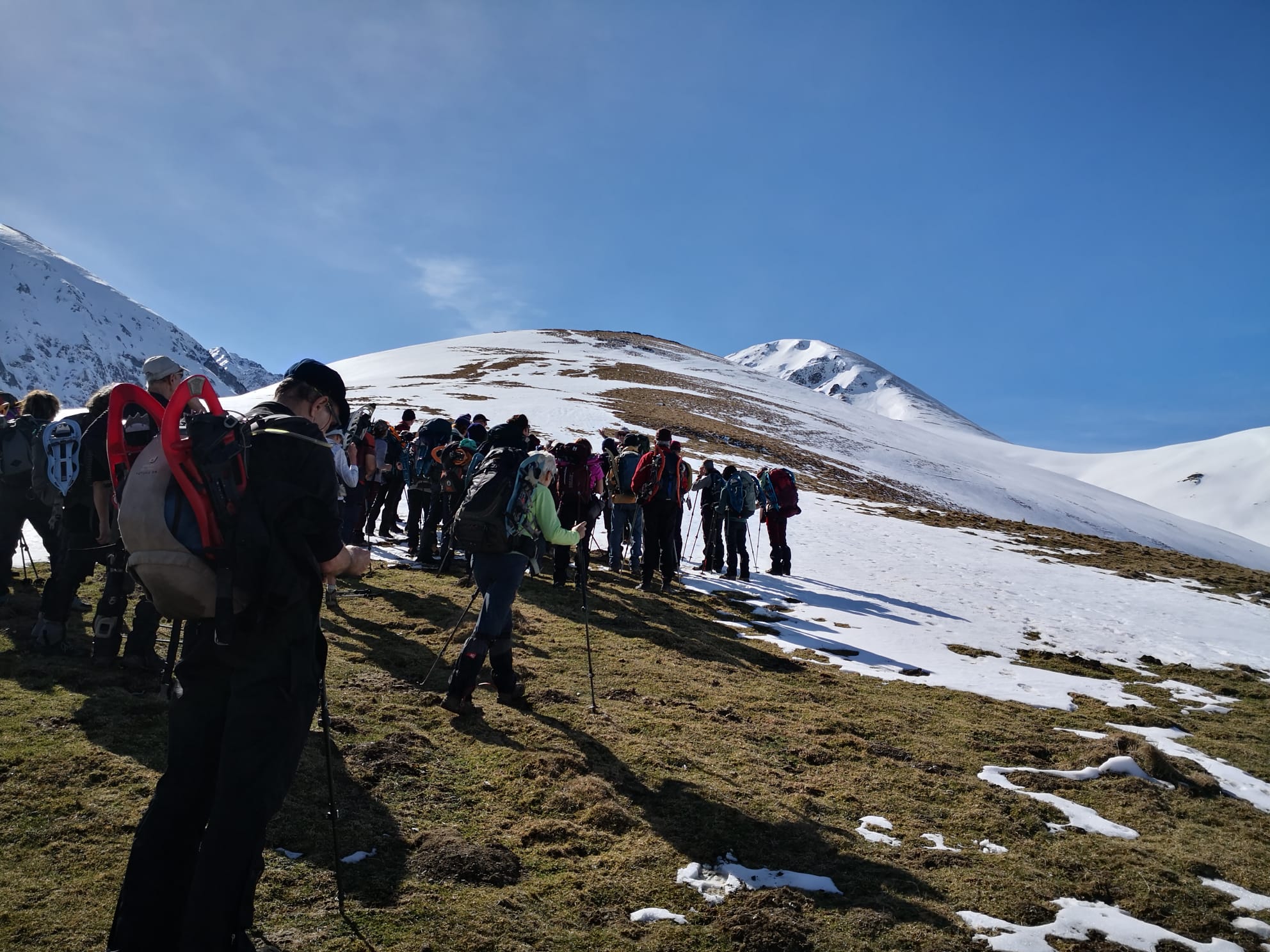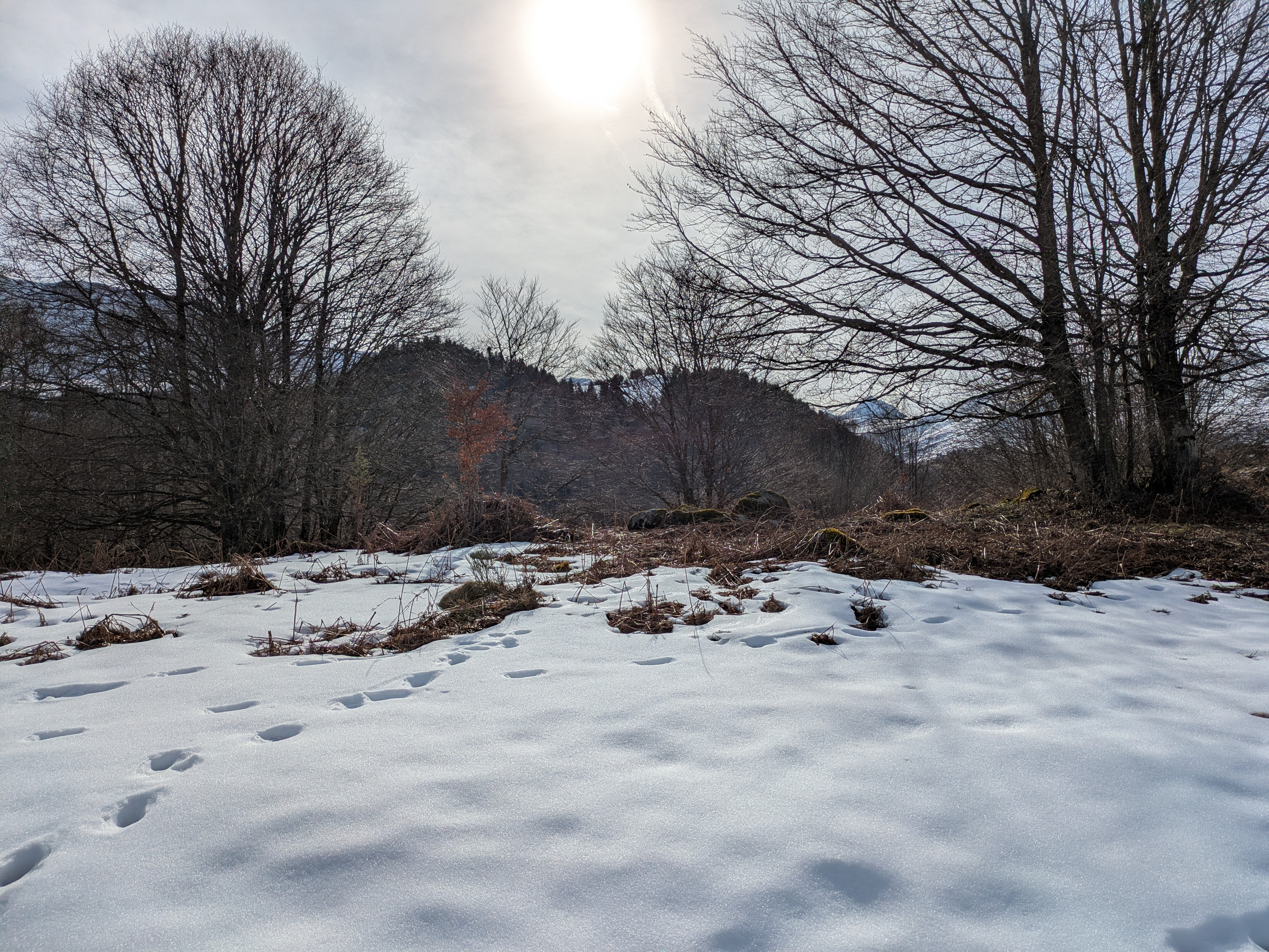 Après ce bain de soleil, nous entamons la descente raquettes aux pieds. La piste c’est assouplie, et en en quelques lacets nous regagnons les prairies printanières.