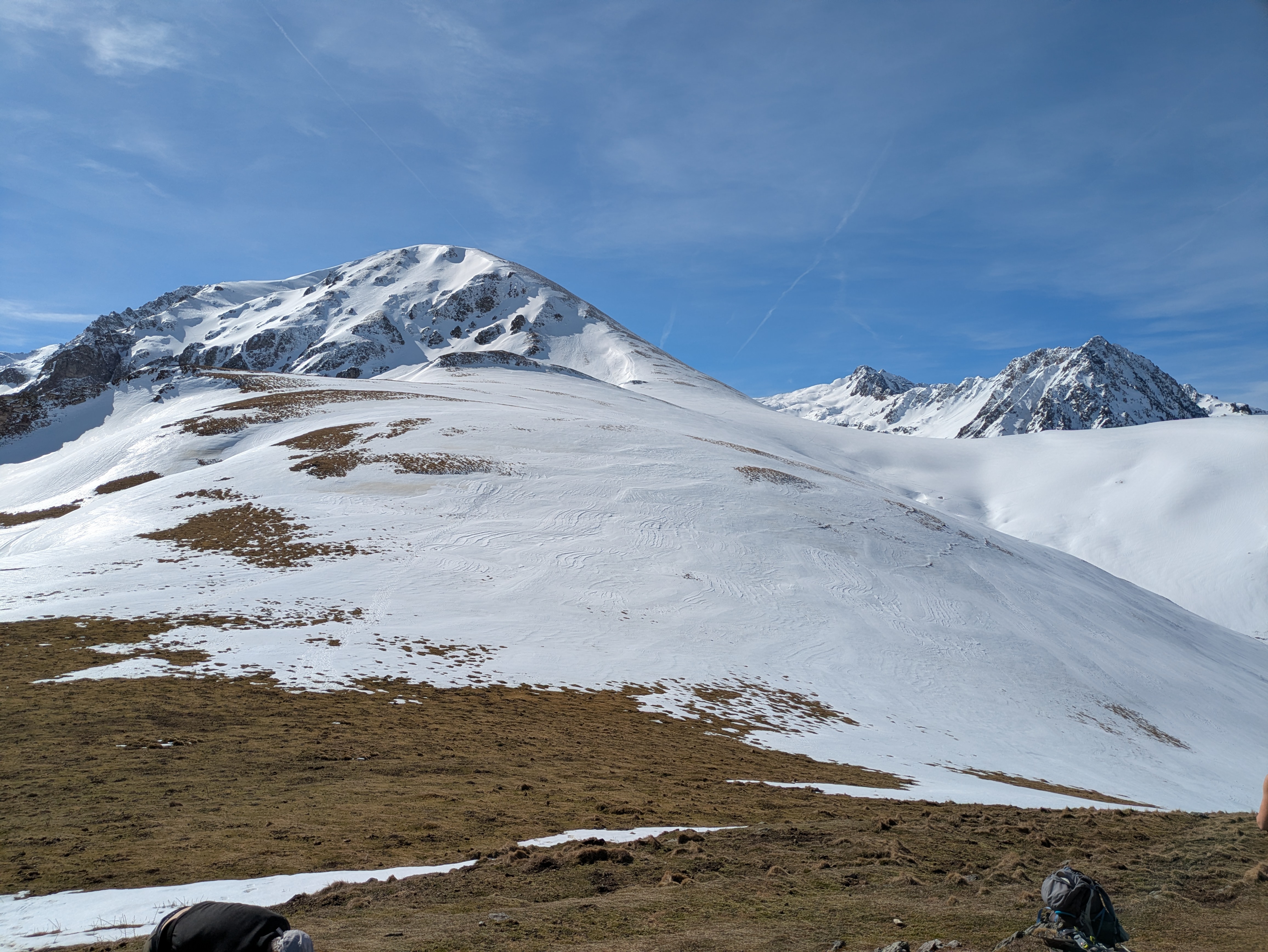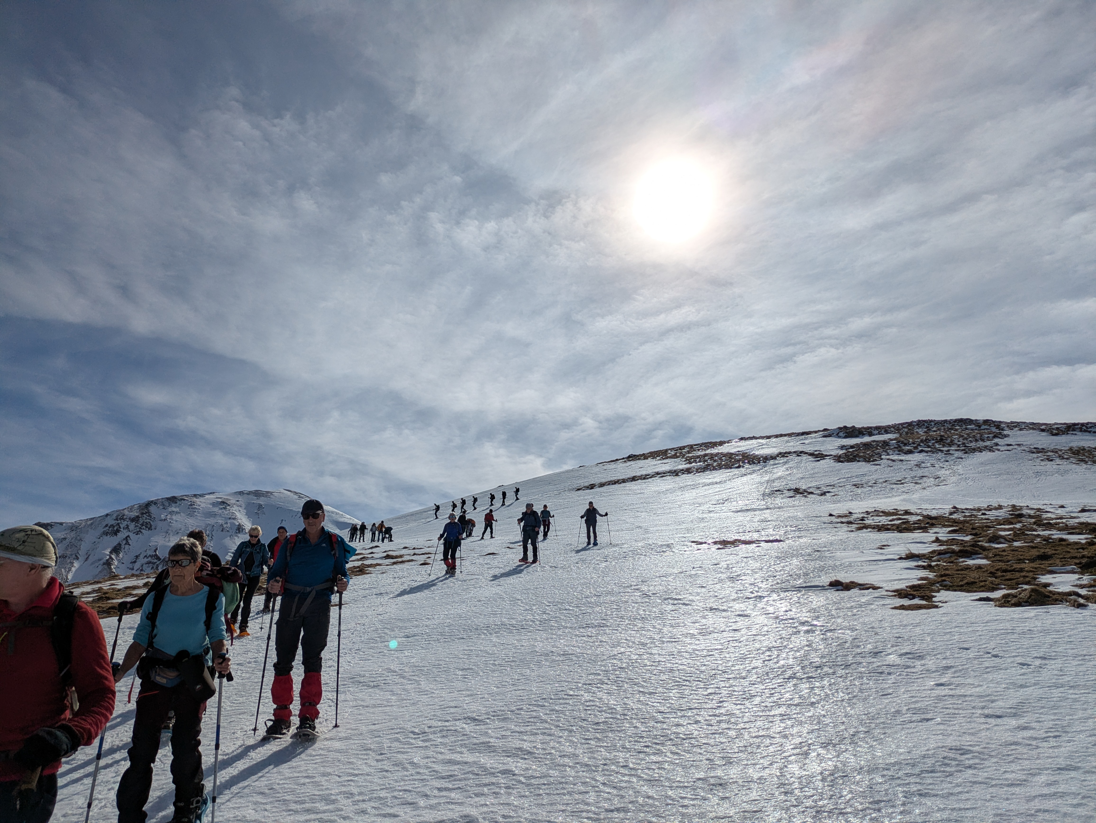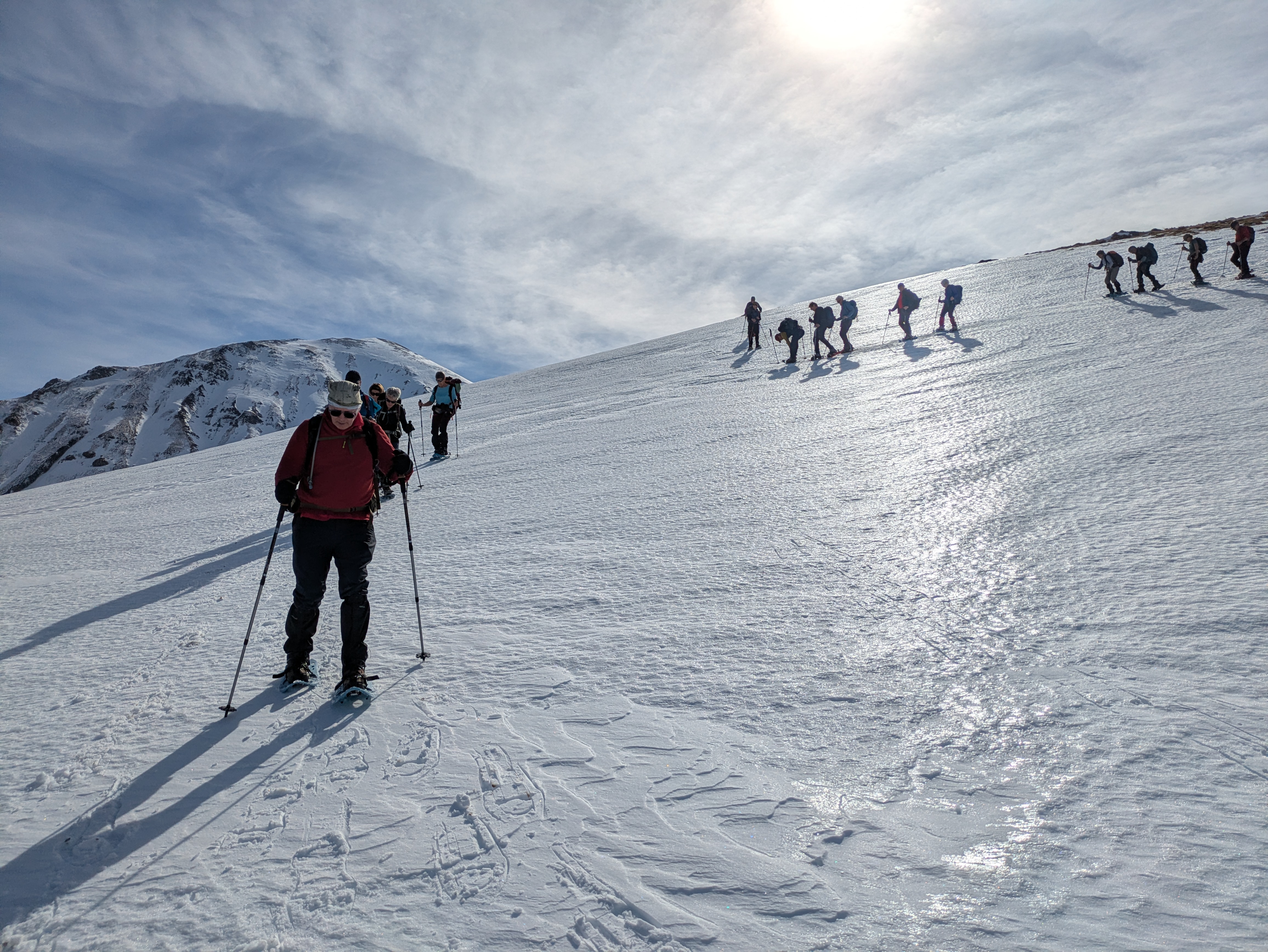Les langues de neiges sont de plus en plus dures. Nous décidons de débrider nos raquettes pour accrocher les derniers mètres.