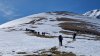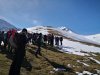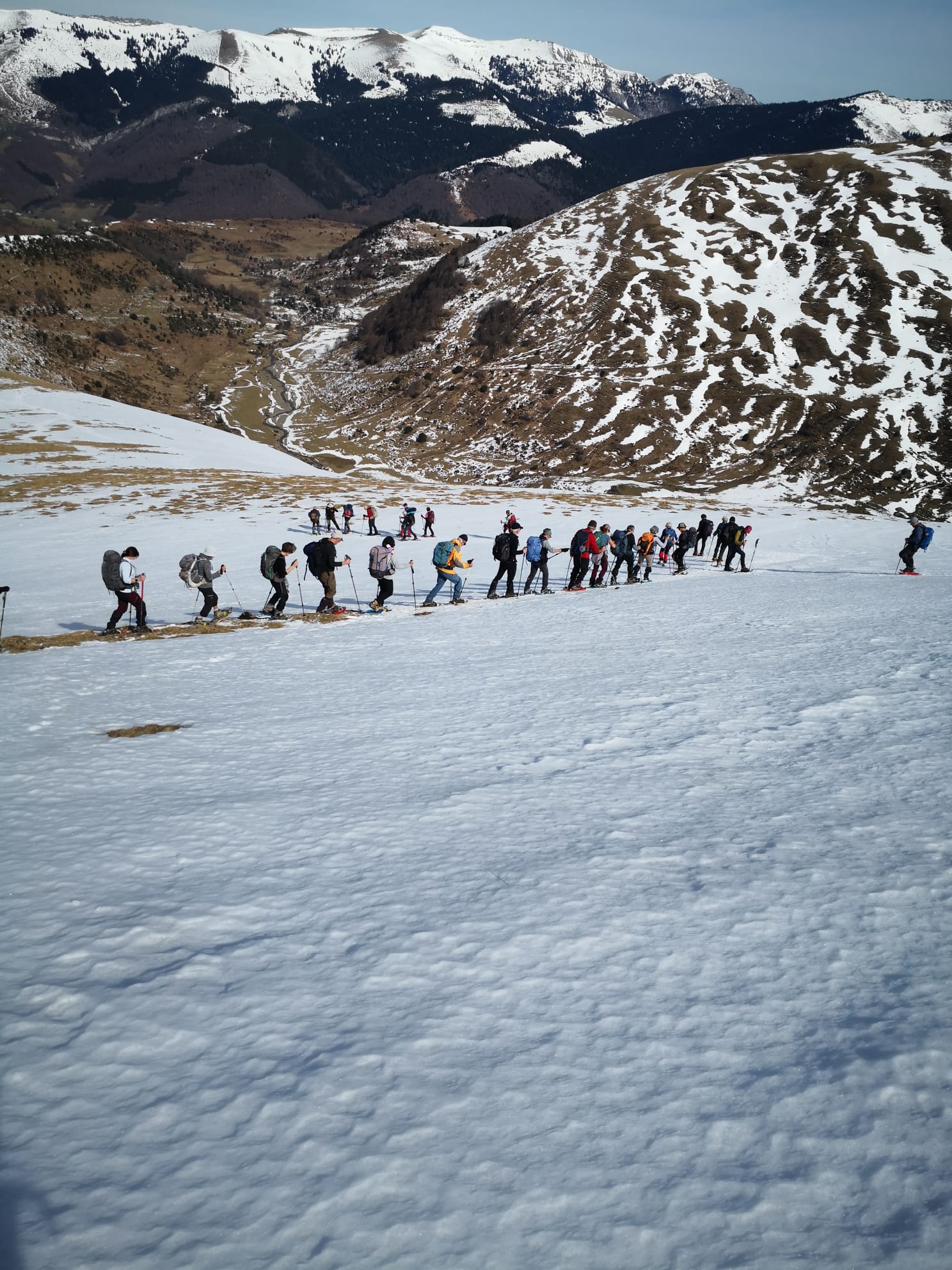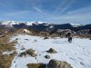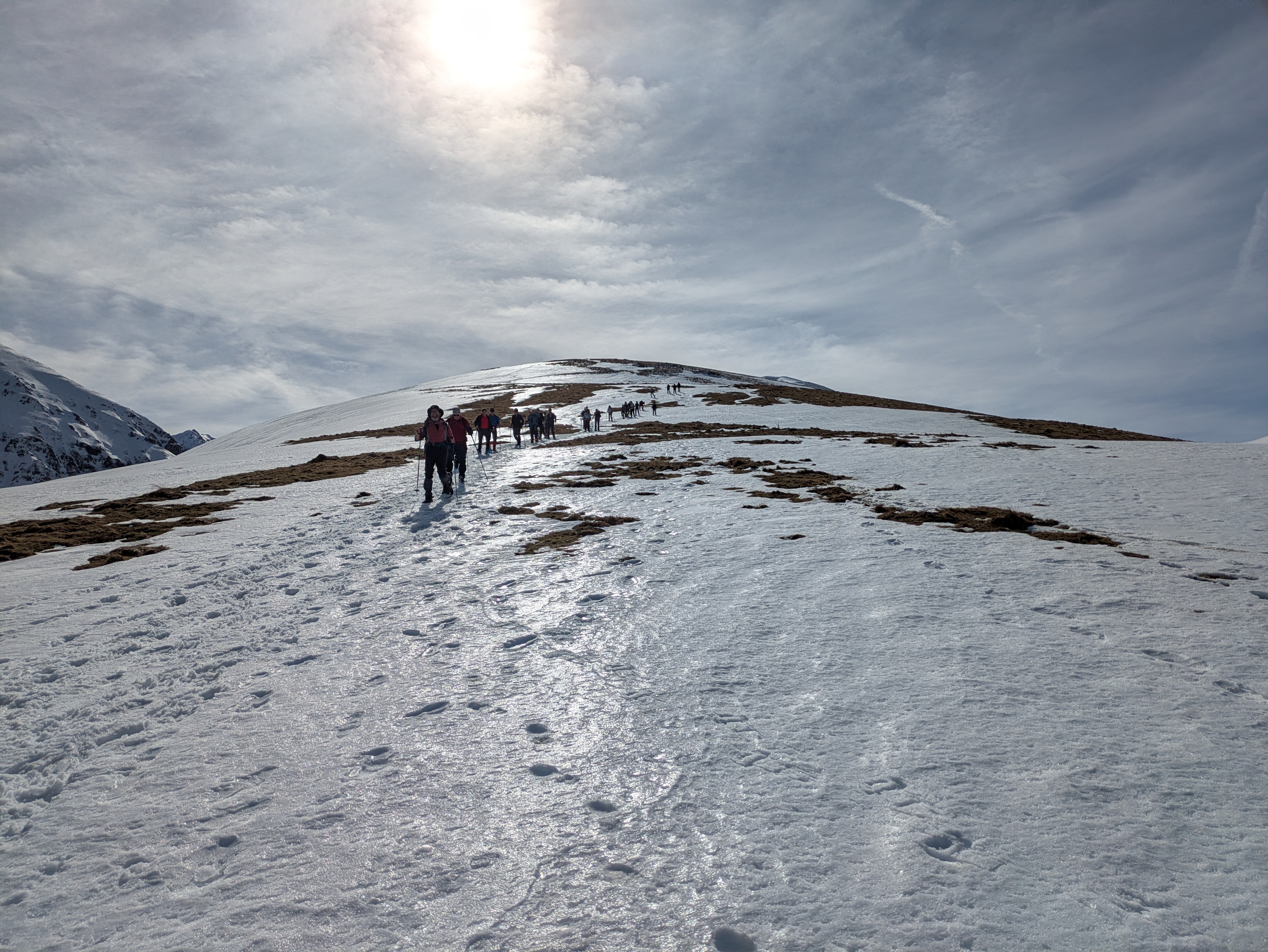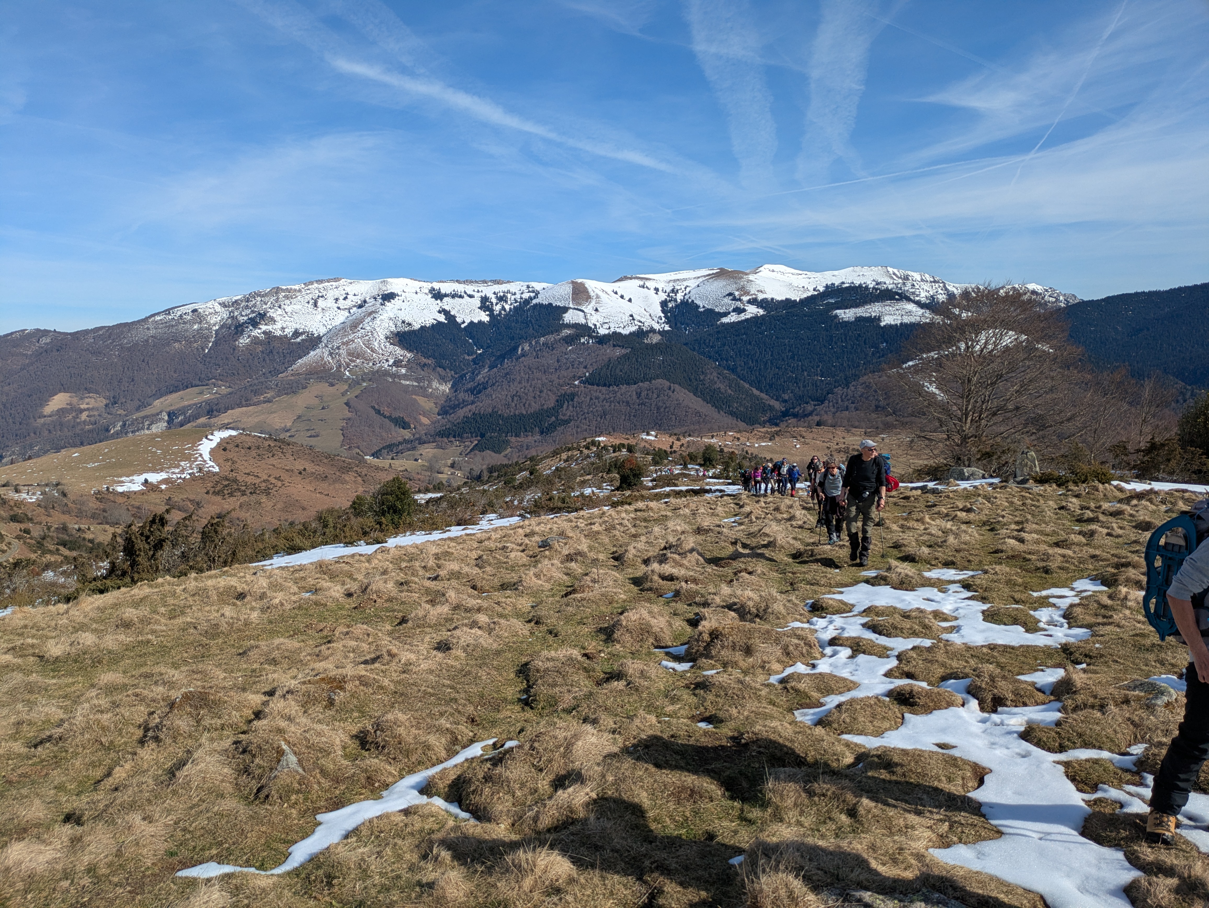 Raquettes sur le dos, nous traversons un large plateau pour gagner le début de la crête.
