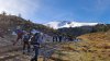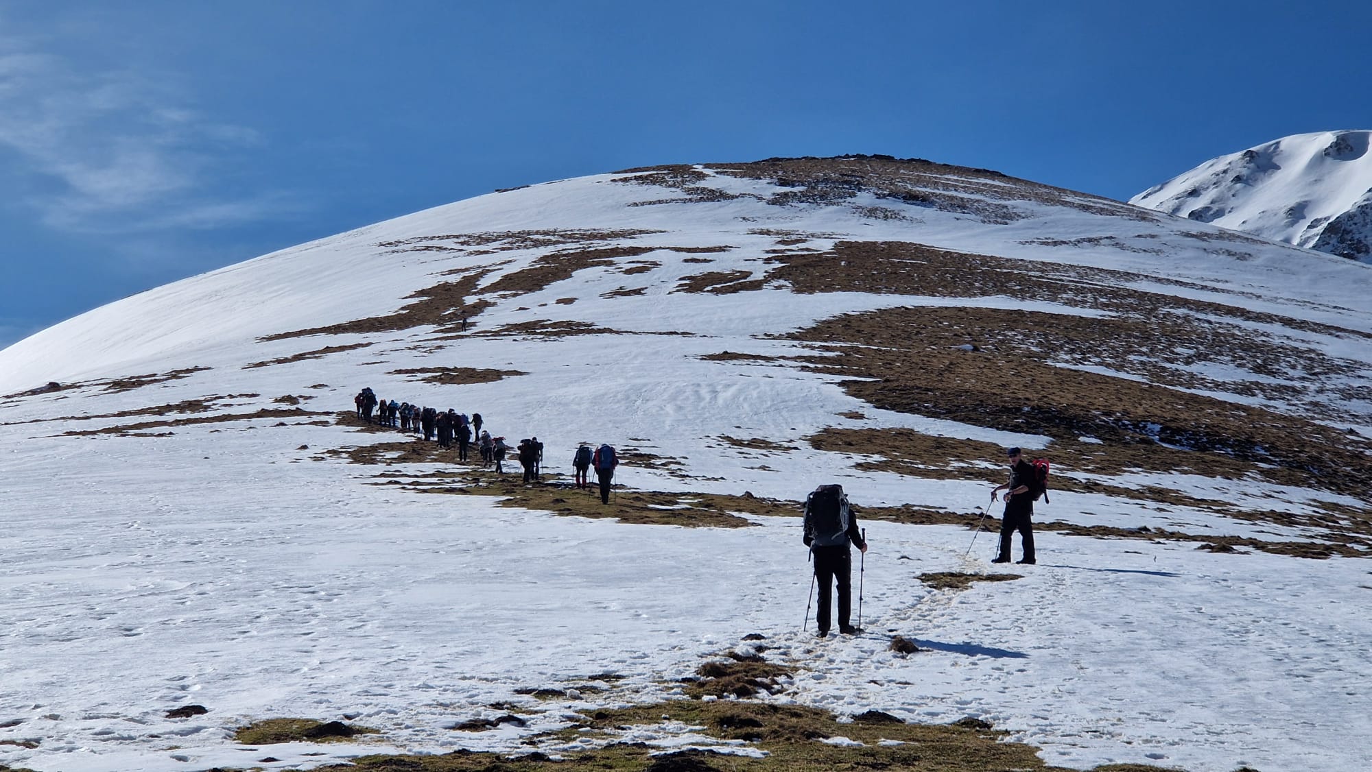 Le soleil commence à chauffer, chapeaux et casquettes vissés sur la tête, nous entamons la longue ascension plein Sud vers l’objectif.