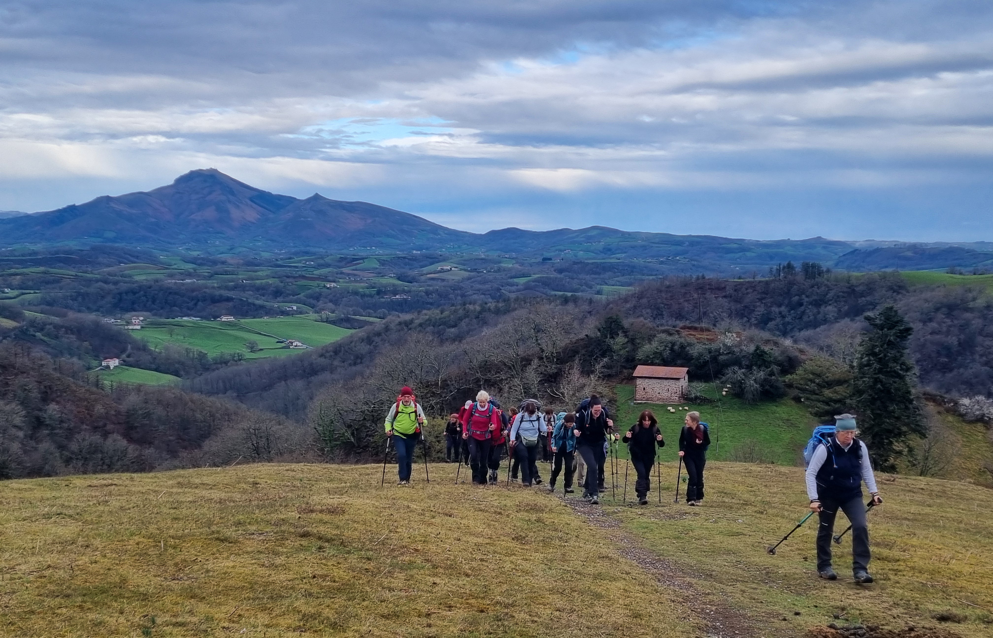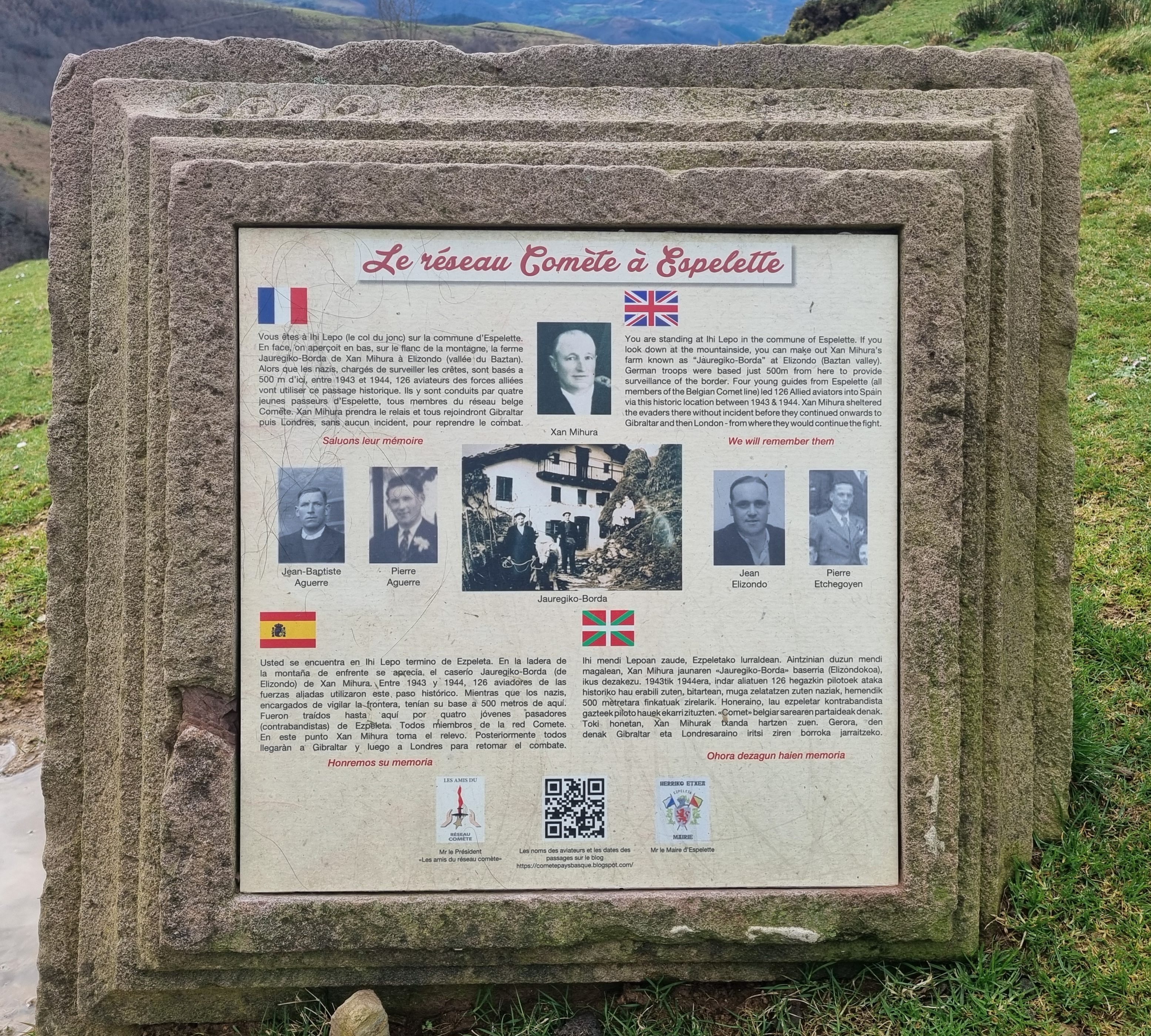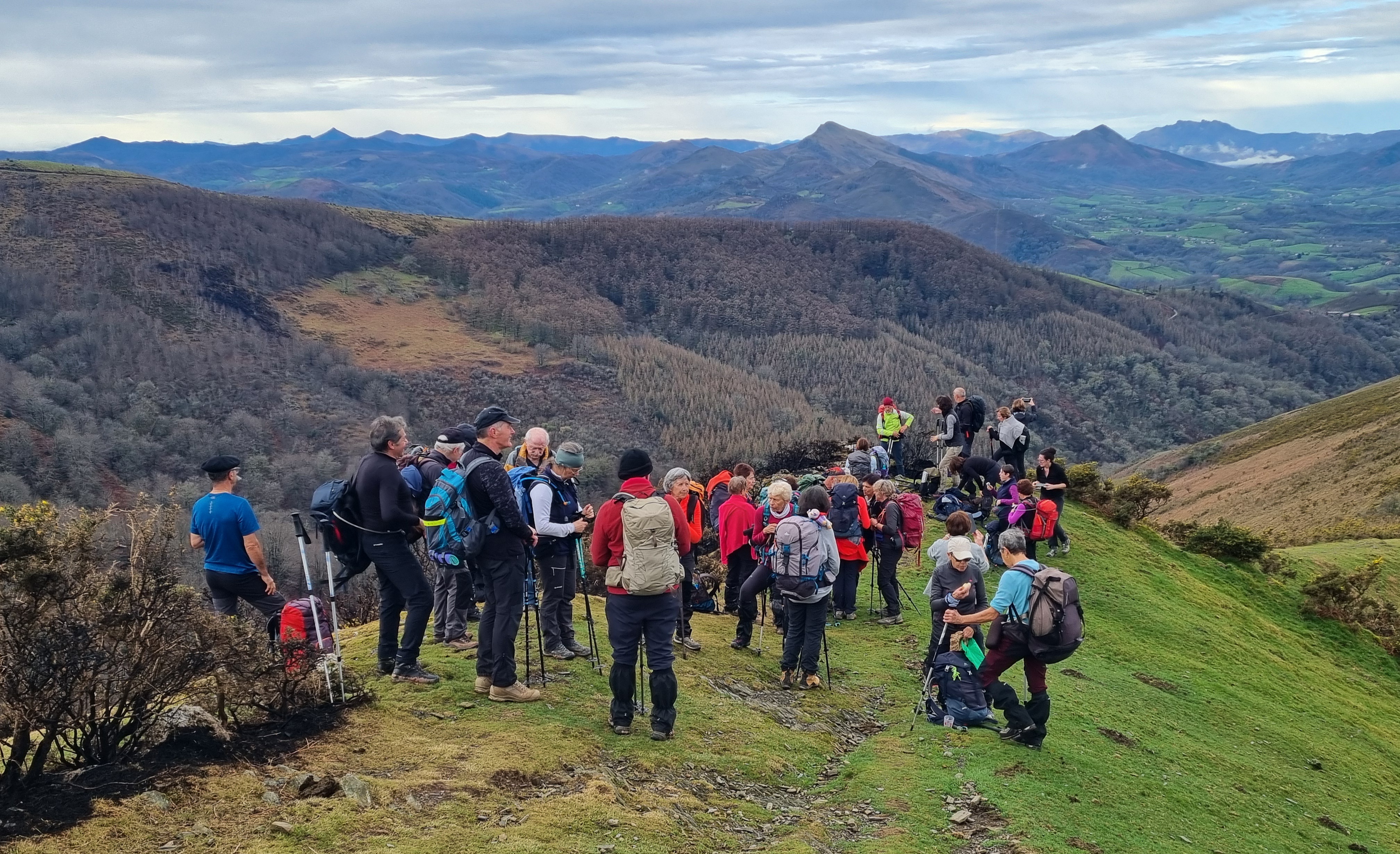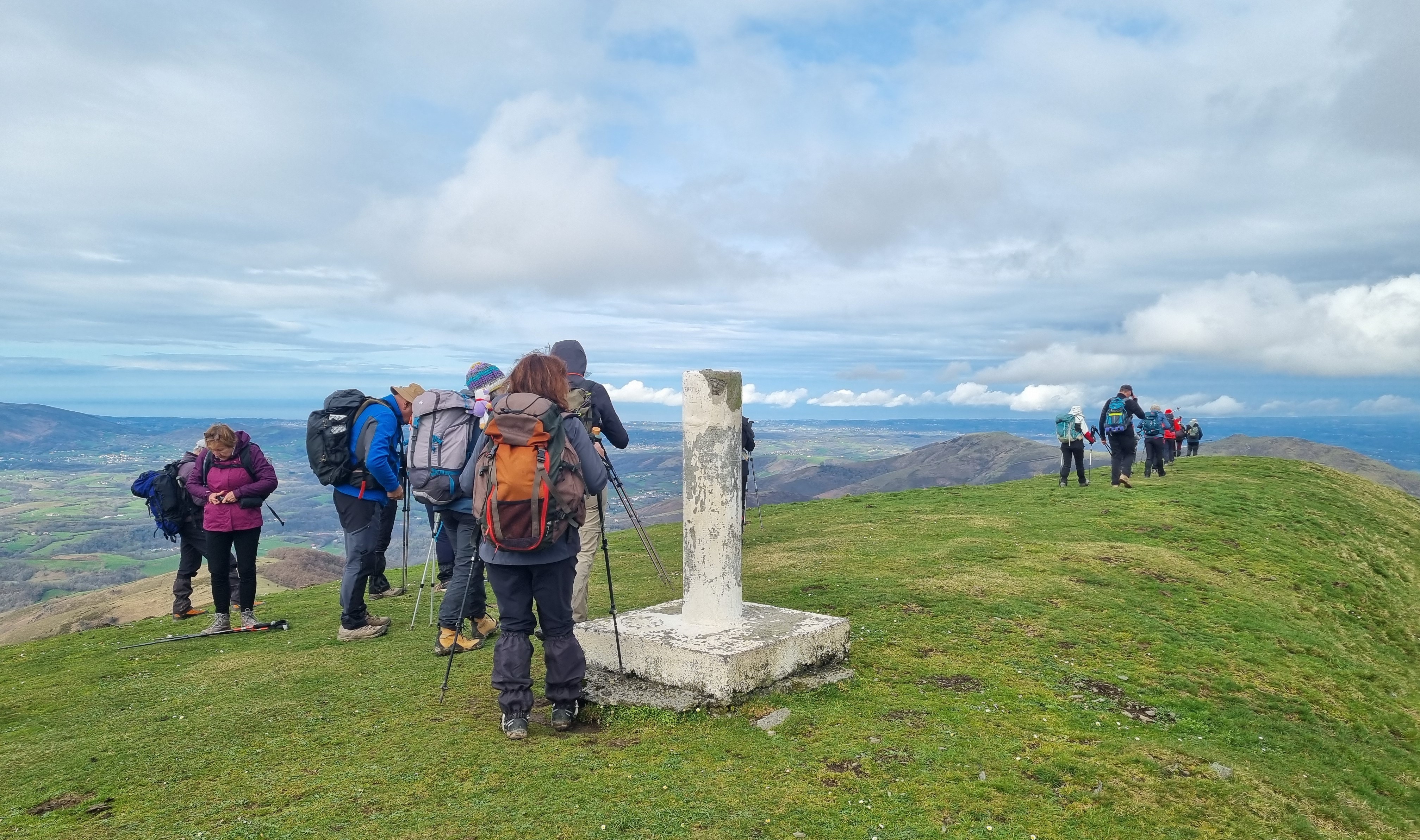 Pourquoi ces 37 adhérents du CMA allaient-ils ce dimanche 8 Mars sous la pluie en direction de Dancharia ? Pour se lancer à l’assaut des ventas faire du shopping ? Que nenni ! Ils partaient en quête d’évasion, l’objectif du jour étant le Lizartzu . Et cette fois il fut atteint après deux tentatives infructueuses dans le passé dues aux caprices de la météo. Ce dimanche tout se présentait pour le mieux : la pluie avait cessé en cours de trajet, Eole dormait, les températures s’ annonçaient clémentes. Donc nous voilà partis de la venta Peyo pour environ 17 km et 850 de dénivelés, essentiellement sur les crêtes. Un peu de route goudronnée puis la traversée de la rivière Lapitxuri vers les crêtres d’Haizagerry jusqu’au col de Gorospil (662m) . Au cours du cheminement nous découvrons une stèle commémorative du réseau Cométe qui nous rappelle que nous sommes un passage historique de" l’armée des ombres".(voir photo) En effet, de 41 à 44, ce réseau de résistance exfiltrait des aviateurs anglais tombés en Belgique ou dans le nord de la France sous les coups de le DCA allemande par le pays basque puis l’Espagne "sous la barbe" des gendarmes de Vichy, des garde-frontières franquistes et bien sûr des patrouilles allemandes pour qu’ils puissent rejoindre l’Angleterre via Gibraltar et reprendre le combat. Grâce à ce réseau Comète fort de 259 résistants, le plus grand réseau d’évasion de la seconde guerre mondiale, 800 aviateurs furent sauvés , 382 purent regagner Londres. En ce jour du Droit des Femmes il n’est pas inintéressant de souligner que ce réseau avait été cofondé et dirigé par une femme Andrée de Jongh dite Dédée. Nous poursuivons notre marche...Une clôture pour tester notre souplesse, quelques efforts dans la pente raide des montagnes russes basques et nous voilà sur le tant convoité Lizartzu à présent vaincu pour notre pause pique-nique. Notre terrasse du jour est exceptionnelle offrant une vue grandiose à 360° : l’Alkuruntz au NO, la Rhune, les 3 Couronnes à l’O, l’Artazamendi, l’Iguzki, Bayonne entre autres... Il faudra pourtant bien redescendre. Quelques arrêts ont permis à Michel en bon pédagogue de réunir ses stagiaires en formation" orientation et lecture de cartes" pour leur proposer des exercices grandeur nature sur terrain. Et nous arrivons assez tôt au bus pour que certains aient le plaisir de faire quelques emplettes rapides ou se désaltérer à la venta. Le chauffeur emprunte un itinéraire inattendu par Souraide ce qui permet de profiter encore un peu des paysages basques. Ce fut une super journée pour tous ceux qui ont voulu croire à la bonne étoile avec l’amélioration de la météo. Un grand merci à notre accompagnateur du jour, Eric, pour nous avoir proposé cette belle sortie. Merci aussi à tous les autres accompagnateurs qui, une fois de plus, ont assuré notre bien-être et notre sécurité. RDV le 29 Mars.